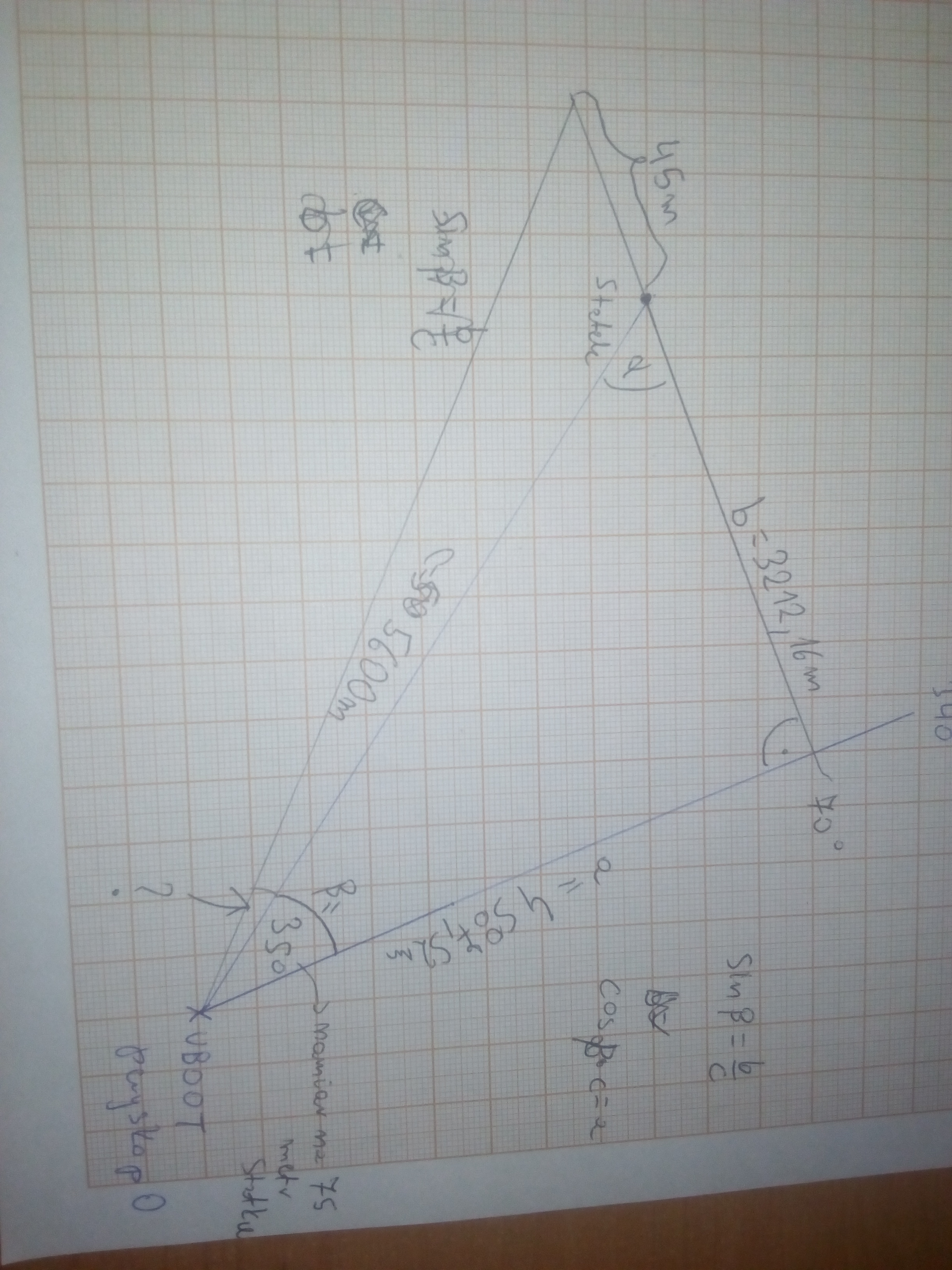 Uboot nieruchomy na kursie 340 dostrzega wroga w odleglosci 5600m plynącego kursem 70. Śródokręcie (75 metr) jest w namiarze 325. Pozostałe boki to a =4587,52 m, b = 3212,16 m. Chcemy trafic w 120 metr statku.