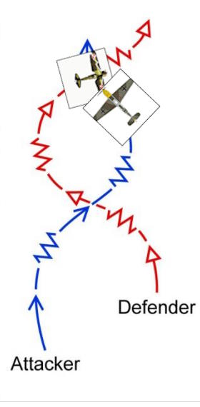 Nożyce. Lecicie zygzakiem, ale tak, aby przeciwnik co jest za tobą (jak źle wyliczy prędkość) wyszedł przed ciebie