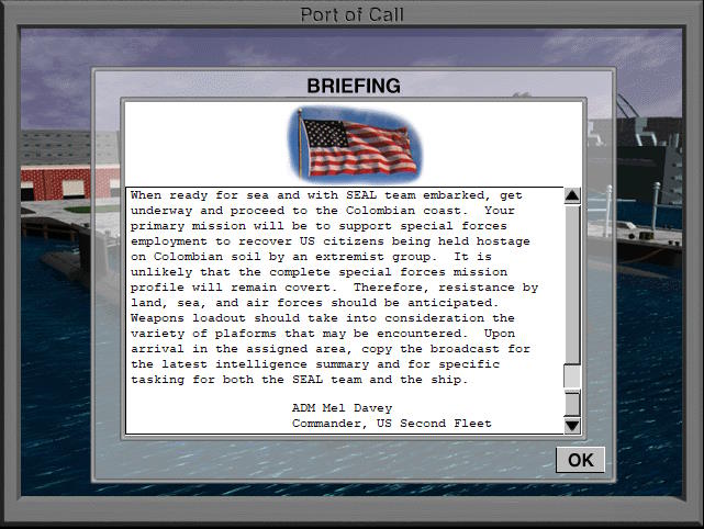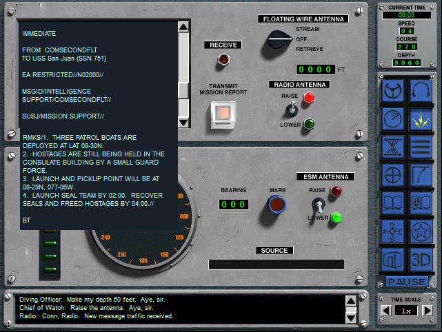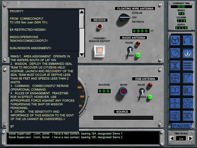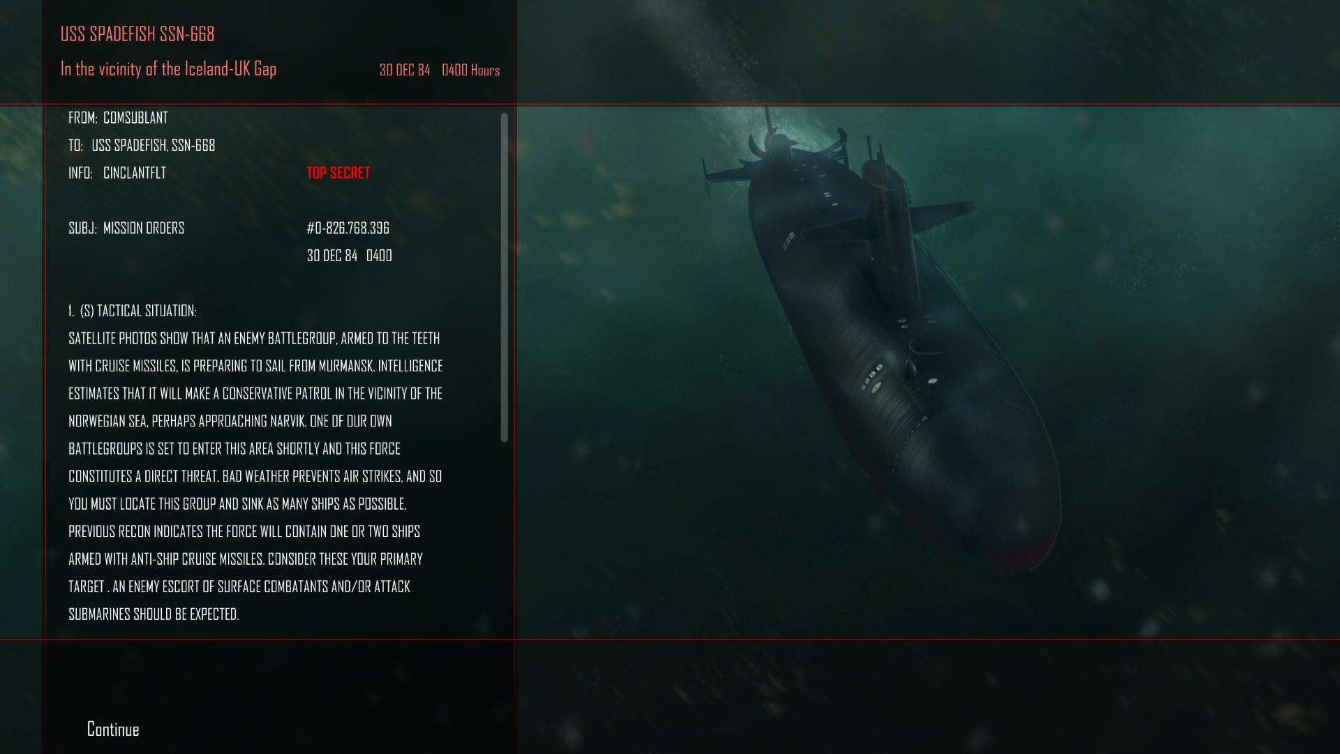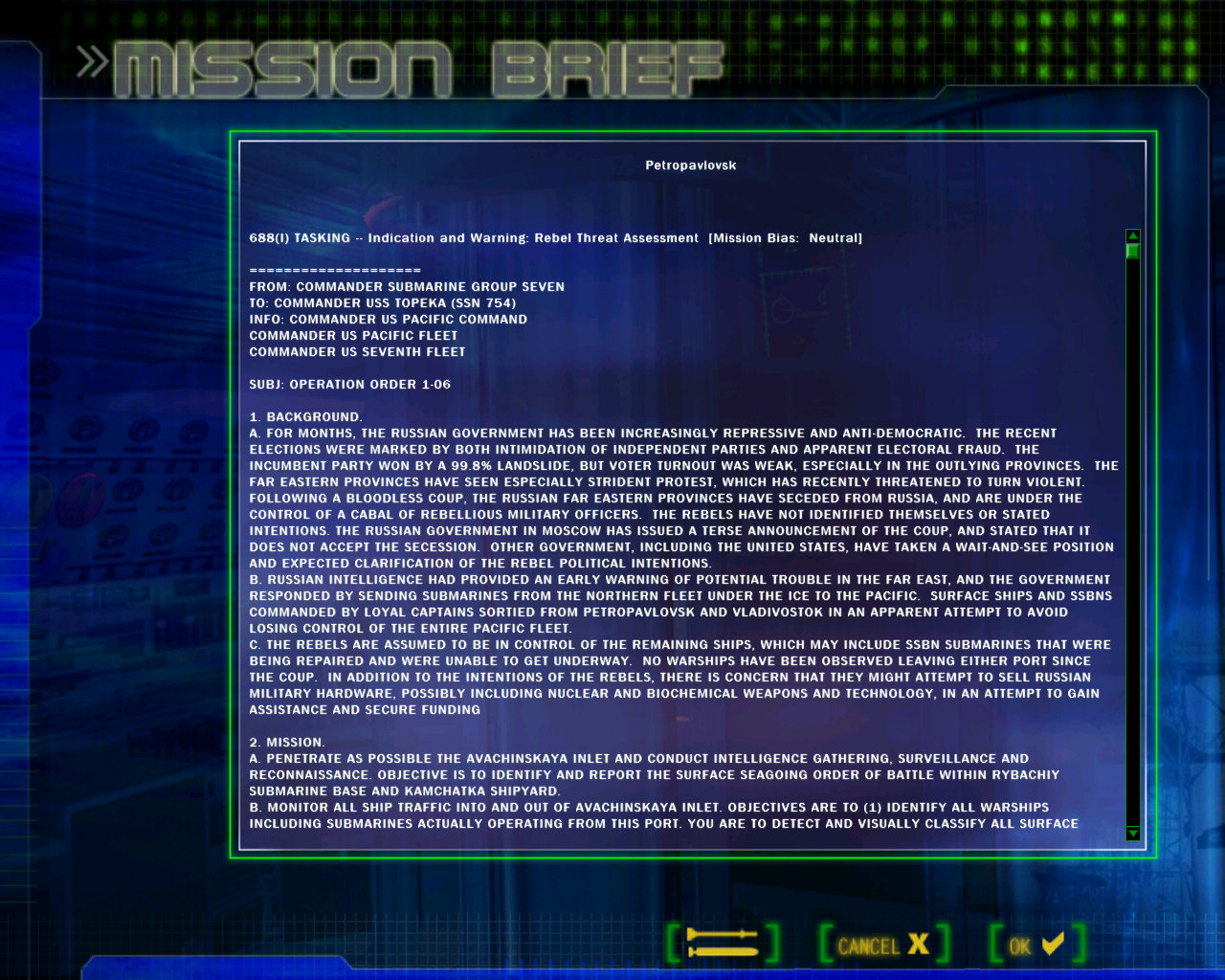 Ruszyłem kampanię i ciut się poprawia. Przed misją mam odprawę z dowódcą, który mówi co i dlaczego... Ale dalej znów są krótkie "od Comsublant" "do: mój okret (jest poprawa)" i "w okolicy masz Akulę, znajdź ją"...