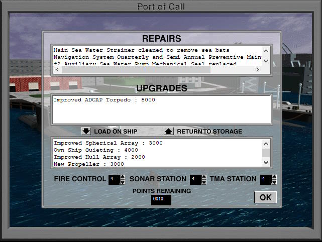 U góry losowo w każdej misji pojawia się, co właśnie zrobiono na moim okręcie. To takie drobne, losowe informacje bez żadnego wpływu na grę. Ale klimatyczne. Filtry wody morskiej oczyszczony z żyjątek morskich, w pompie wymieniono uszczelki...