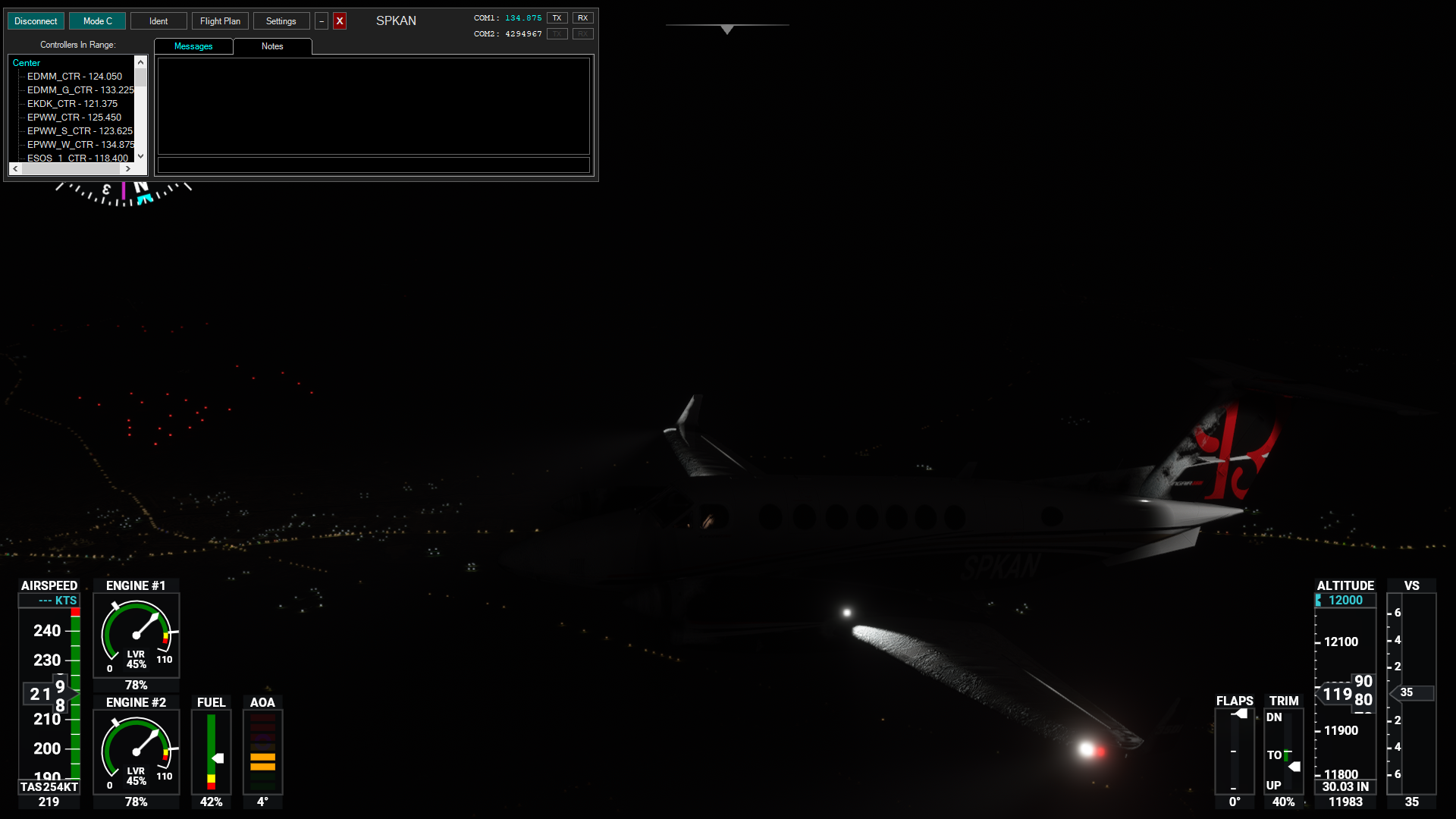 Mając to za sobą wróćmy do bezpieczniejszych kwestii. Wykonałem kolejny lot na Vatsim :D Trasa powrotna EPWA EPKT. Trudne warunki, na mojej trasie była mgła, chmura i generalnie -10*C na zewnątrz to oblodziło mi samolot. Lekkie turbulencje zanim się zorientowałem i włączyłem odladzanie. Potem były drobne problemy z podejściem. Albo kontroler przecenił możliwości King Air do obniżenia lotu albo zapomniał. Podejście było ostre :D Normalnie powinienem odejść na drugi krąg, ale EPKK tower zamykał za parę minut, a nie było innego kontrolera online (poprzedni co mnie "miał" EPWW_S_CTR już zamknął) to zrobiłem to ostre podejście i wylądowałem bezpiecznie :D Vatsim jest super :D