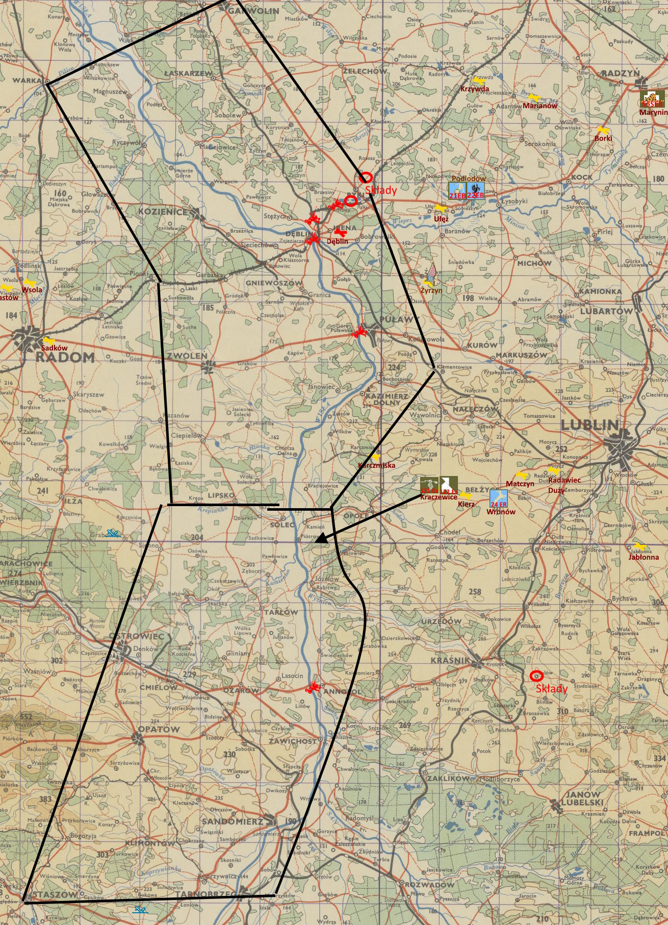 Czyli:W zasadzie głębokość terenu nie stanowiła takiego problemu, jak jego długość... Front znajdował się w górze Wisły, więc im dalej lecieliby na południe, tym bliżej frontu by się znaleźli.. Z drugiej strony w razie nalotów na Dęblin, im dalej byliby na południe tym dalej byliby od zagrożenia... Ale jednocześnie przeprawy przez Wisłę były też na południu w ich sektorze.