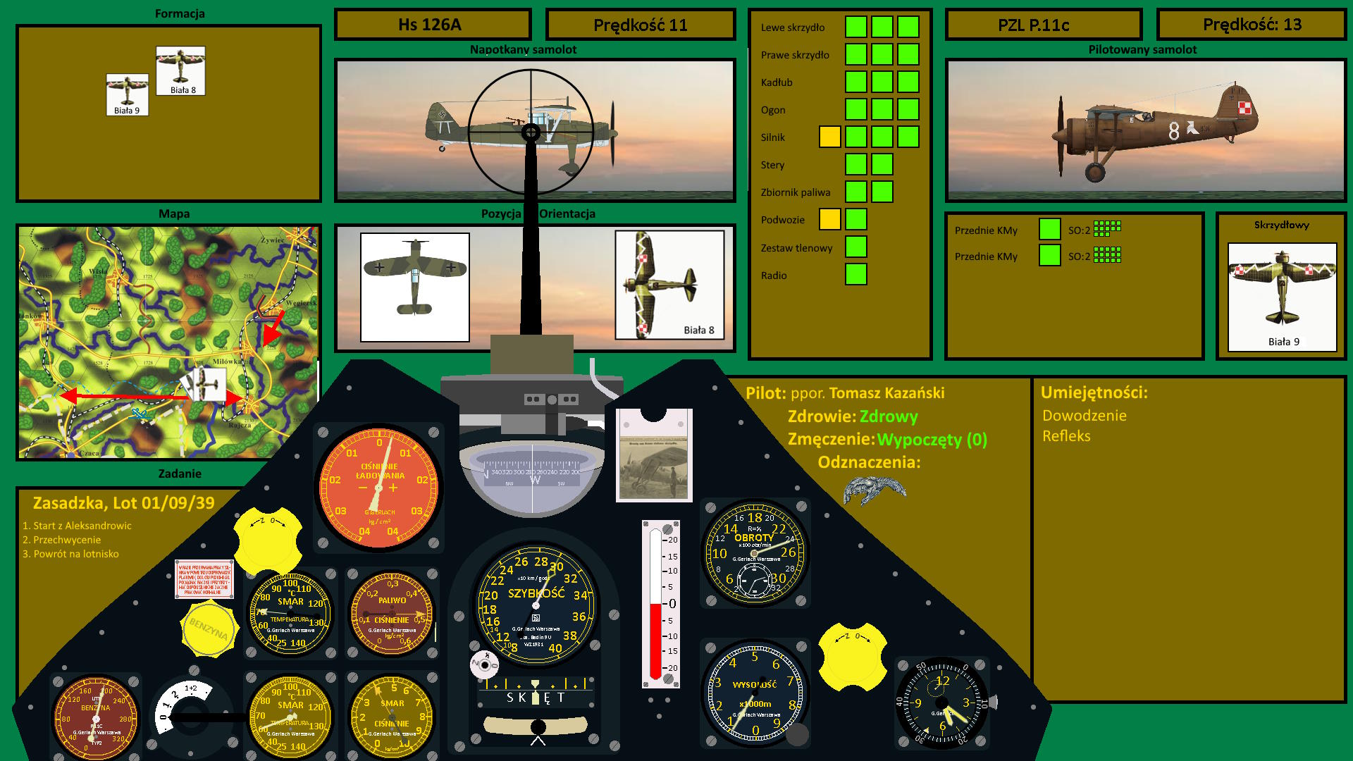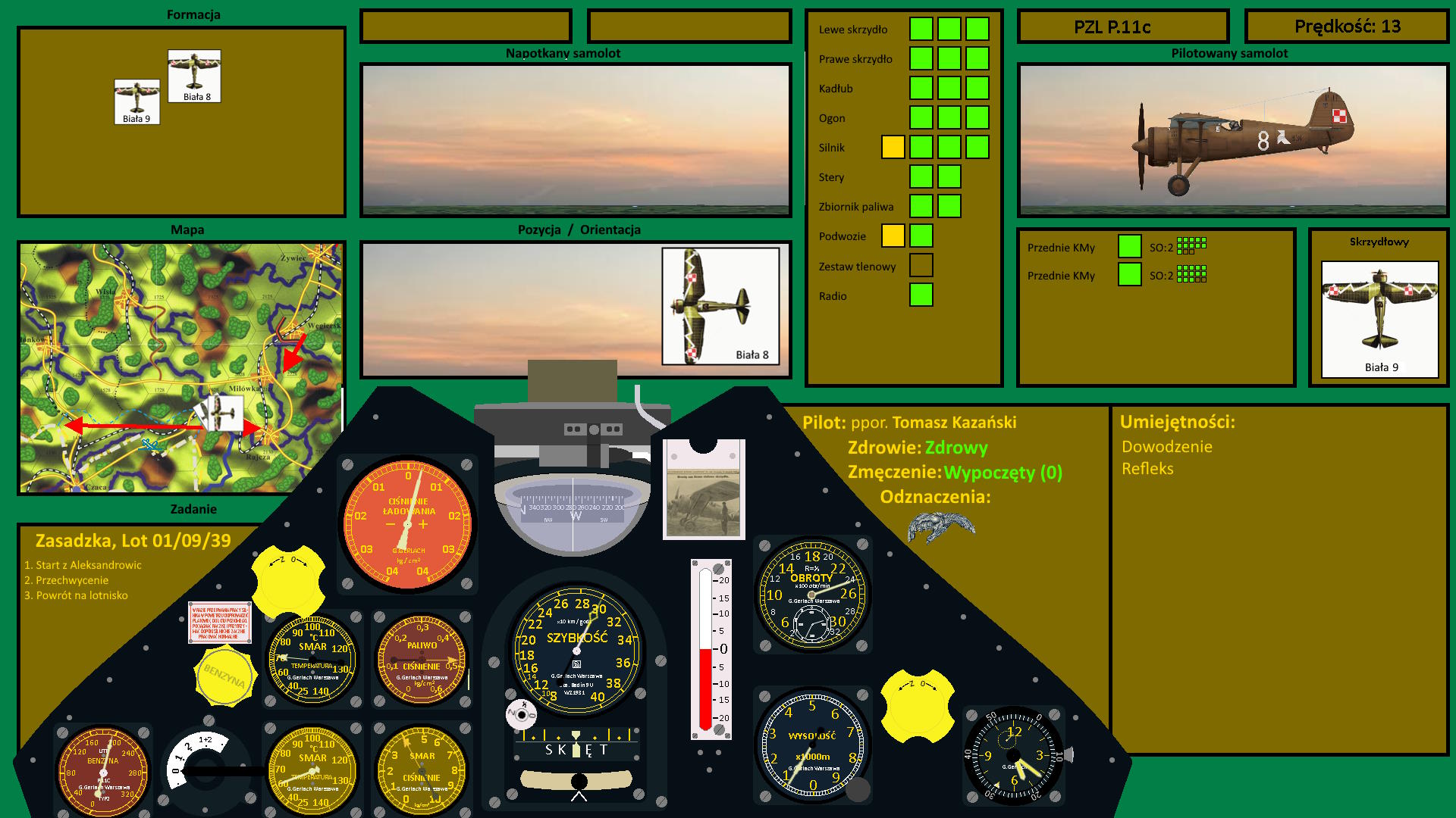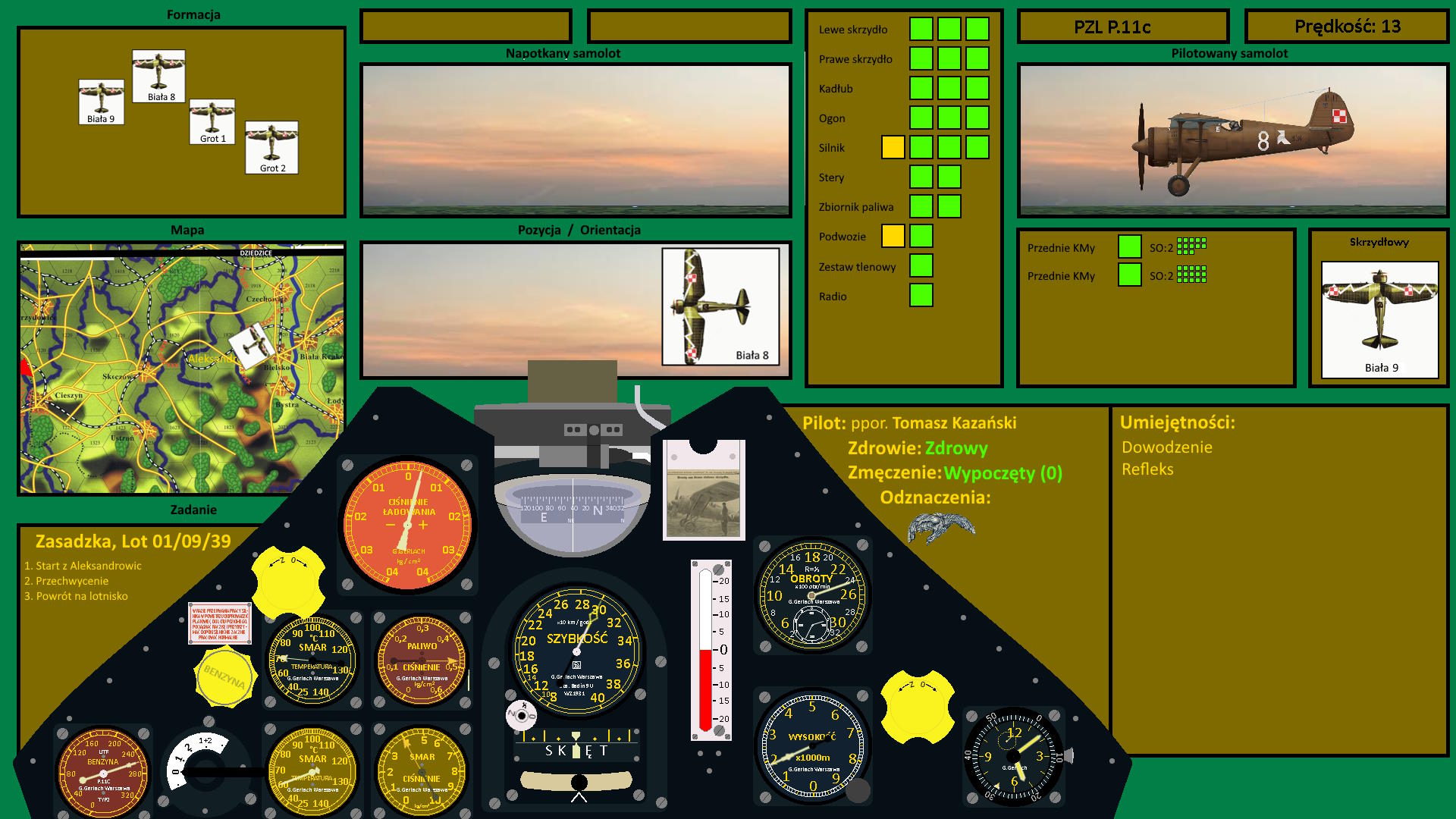 Tomasz nie przejmował się już samolotem nad Bielskiem. Teraz przed nim był inny cel. Leciał wzdłuż torów szukając przeciwnika i wtedy dostrzegł dziwne dymy przed sobą. Wyglądało to, jakby palił się las. Nie był to jednak pożar, a dym z wybuchów, które następowały po polskiej stronie. I nagle na tle tego dymu Kocur dostrzegł niewielki punkt. To był cel, którego ścigał. Na tle chmur też musieli być widoczni, gdyż gdy tylko zbliżyli się, nieprzyjacielski samolot zaczął wznoszenie się ku chmurom. Tomasz miał dziwne uczucie, że już to gdzieś widział. Niemiecki samolot przypominający polską Mewę i lot w kierunku Skalite z wzajemną wymianą ognia... Polskie myśliwce miały przewagę wysokości, szybkości i siły ognia... Po stronie wroga stały natomiast niskie chmury...
