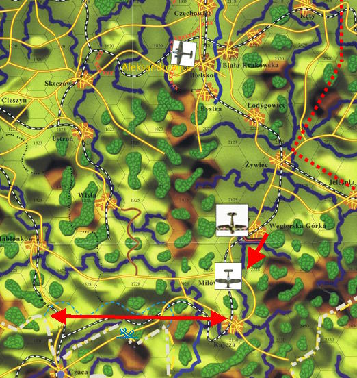 -Klucze, mam potwierdzony samolot zwiadowczy pomiędzy 14-30 (Przełęcz Jabłonkowska) i 21-30 (Rajcza), poniżej chmur. Kolejny między 05-18 (Bogumin) i 11-22 (Cieszyn), następny 13-14 (Żory) -18-15 (Pszczyna) i dwa nad Śląskiem. Znad całego Śląska meldują samoloty zwiadowcze, myśliwskie i bombowe. Już nawet odebrałem prośbę o zbombardowanie nieprzyjaciela pod Skalite. "Kocur", jakiego celu szukamy? Gdzie nie polecisz, są hitlerowskie maszyny.