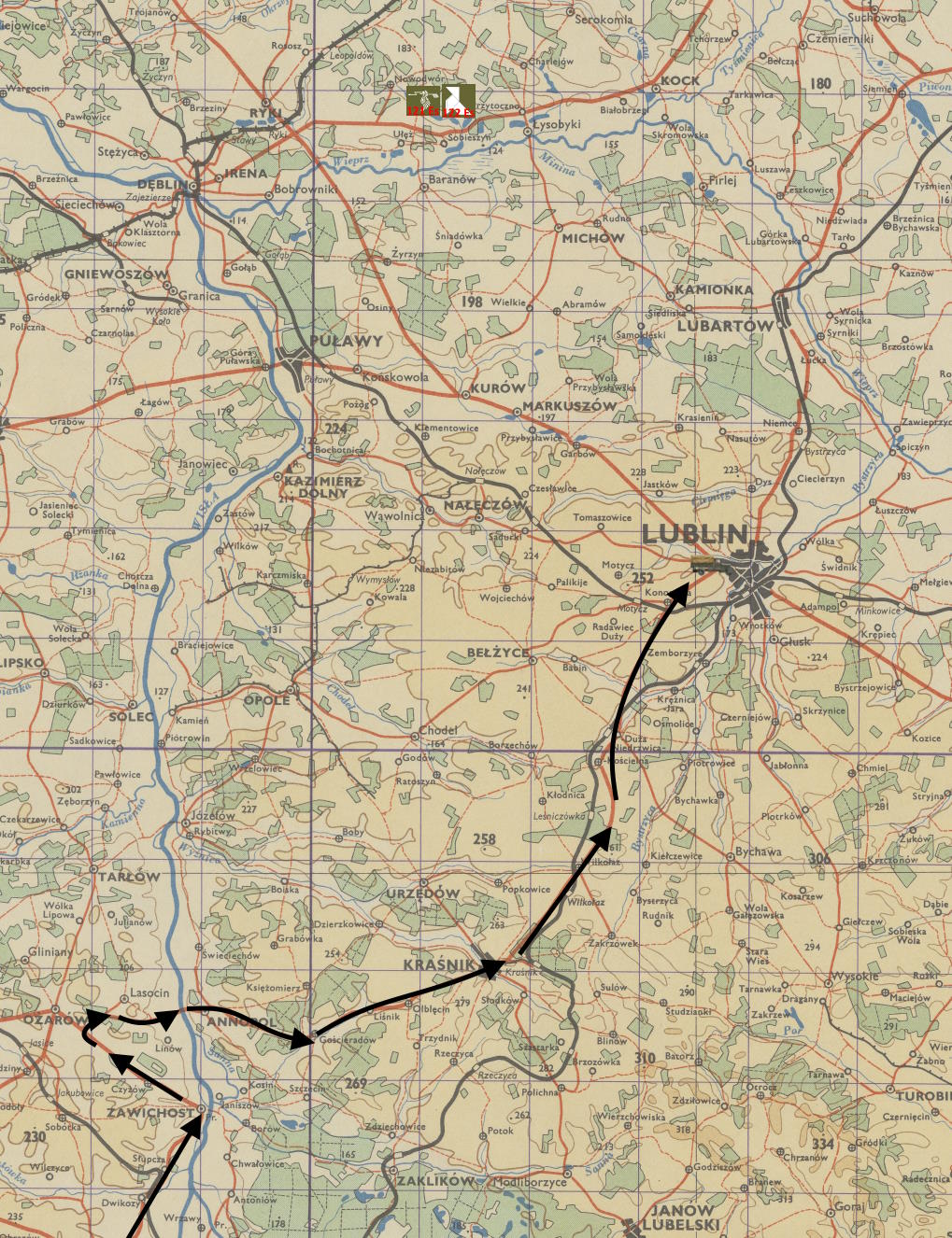 Wreszcie dojechali do szosy Puławy-Lublin, która była zatłoczona wędrującym w dwie strony tłumem uciekinierów pomieszanych z kolumnami żołnierzy. Ku zaskoczeniu Tomasza kierowca skręcił jednak nie w stronę Puław, a w stronę Lublina i natychmiast zameldował: