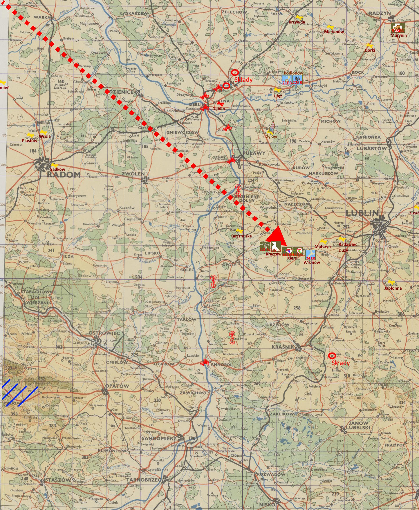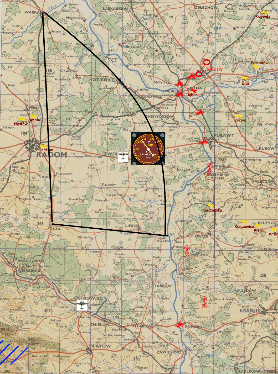 Wasz obszar to Iłża-Solec-Warka... Tylko trzymajcie się z dala od obszaru Dęblin-Puławy... Już wczoraj pokazali, że nie lubią tam nie tylko Niemców. Spójrz.. Tu są trzy radiostacje. Kazimierz Dolny, Józefów, Garbówka. Pomogą wam z naprowadzaniem, jak coś zobaczą.