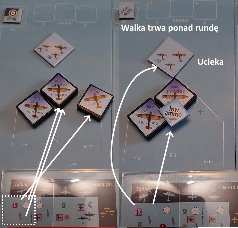 Lider niebieskich markował atak, aby odciągnąć ogień wroga, uzyskując kilka przestrzałów, po czym na końcowe maszyny padły w pełni uzbrojone Hurricane. I już po chwili Niebieski 3 i Żółty 3 mogli dopisać kolejny krzyżyk na swoje konto
