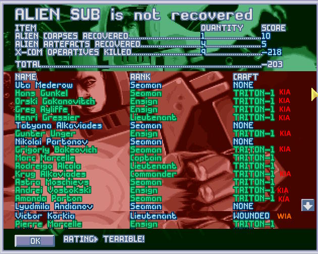 Raport który składał admirał X-COM był tym, czego komisja oczekiwała od początku wojny. Zwycięstwo. Wielki Śniący jest pokonany. Jednak w raporcie znalazła się informacja o ilości poległych w wojnie... w tym cały oddział Lewiatan...