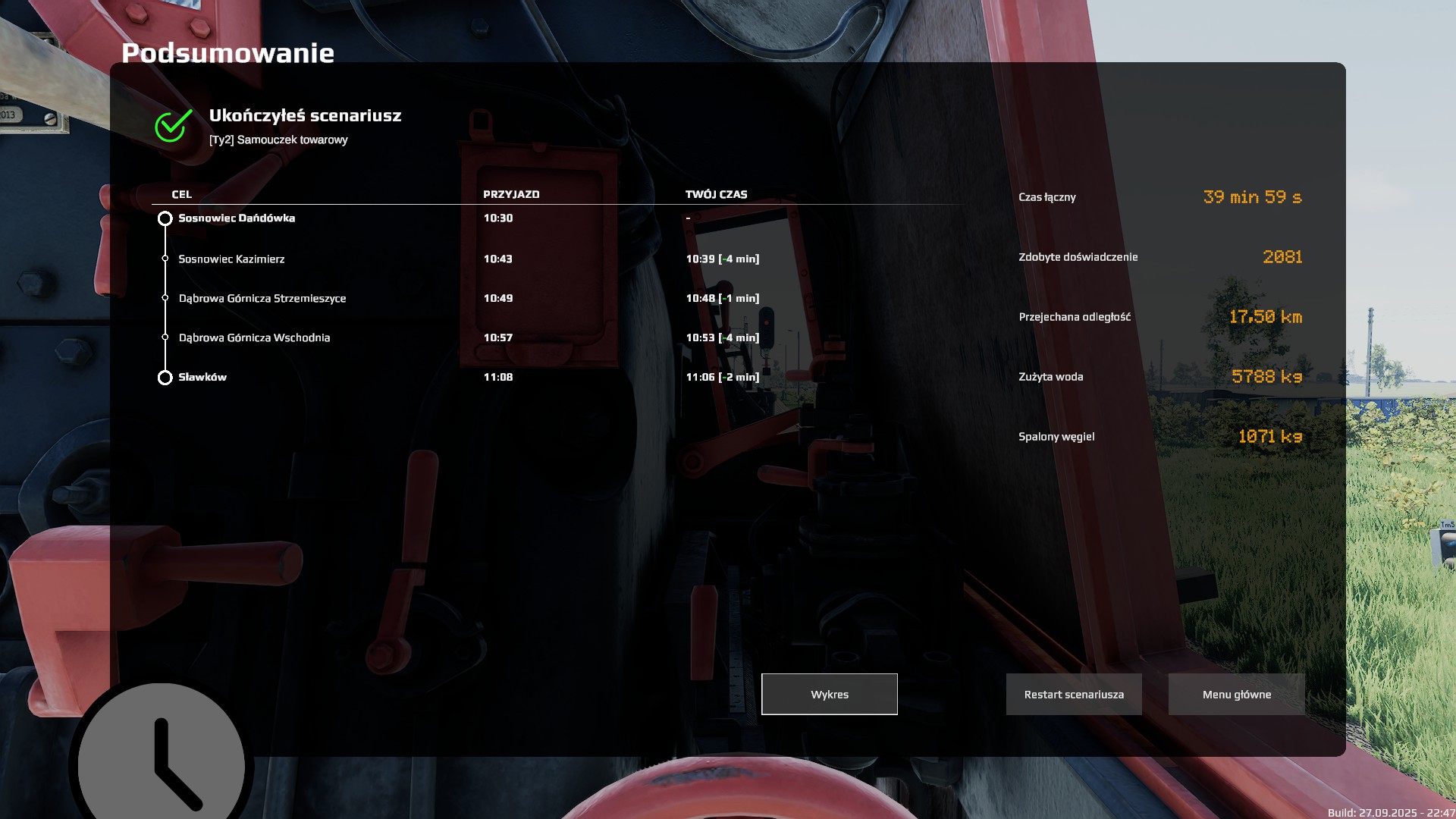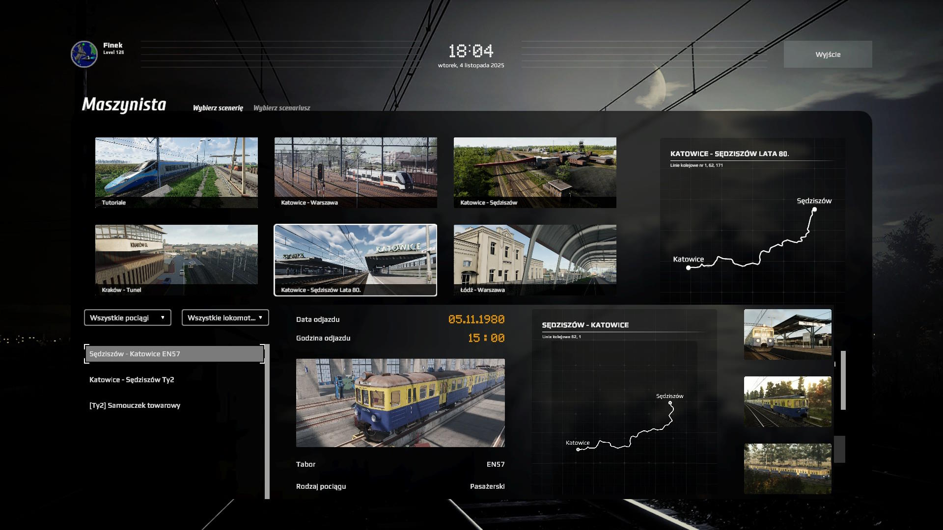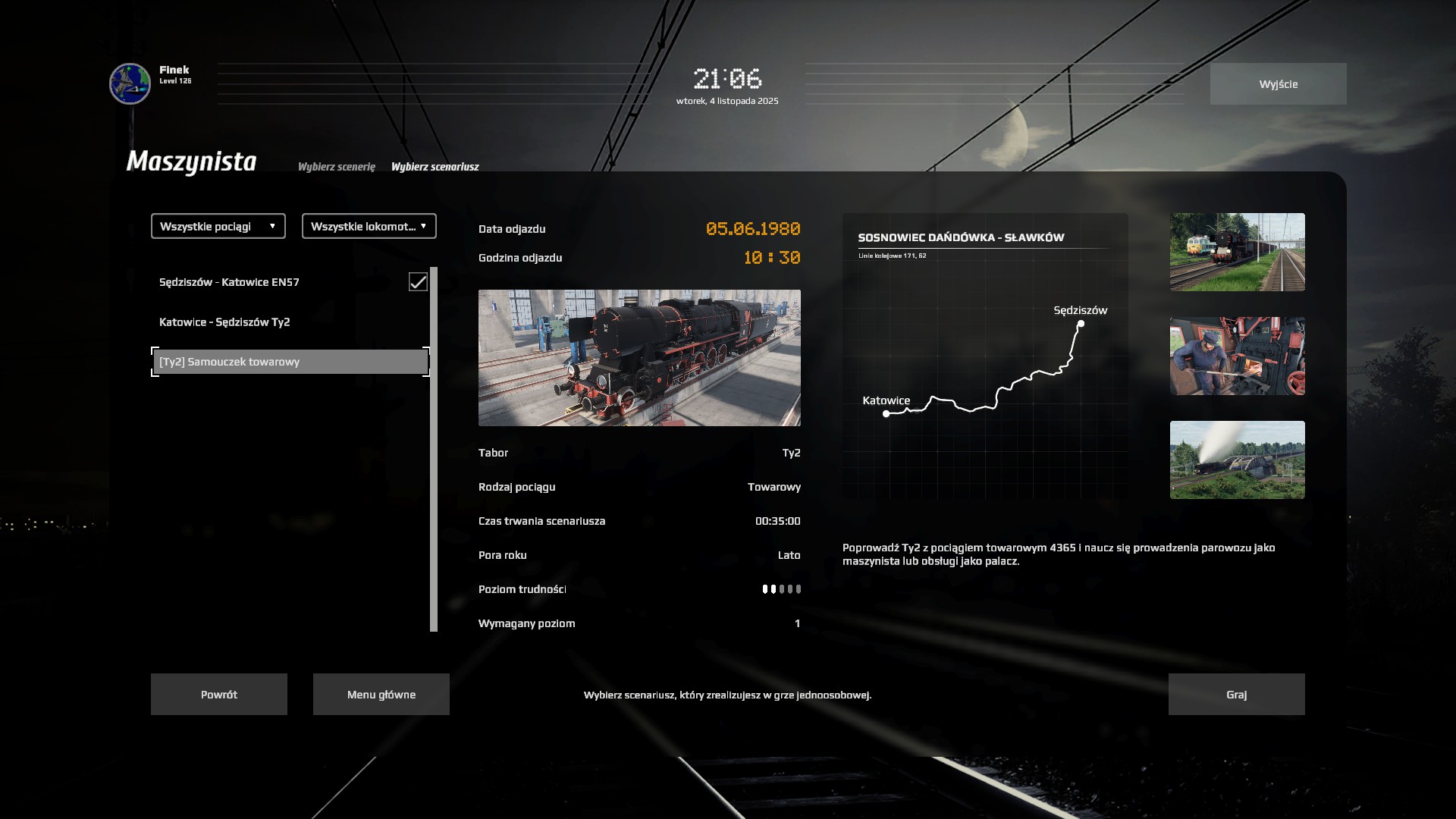 Palacz czy maszynista? Może palacz i eksplozja kotła? Nie... Maszynista... Ja trudny scenariusz (ilość wagonów)? Może średni na początek. Start. Zaczyna się dobrze. Uczą mnie obsługi, są pociągi AI. Zapowiada się dobrze