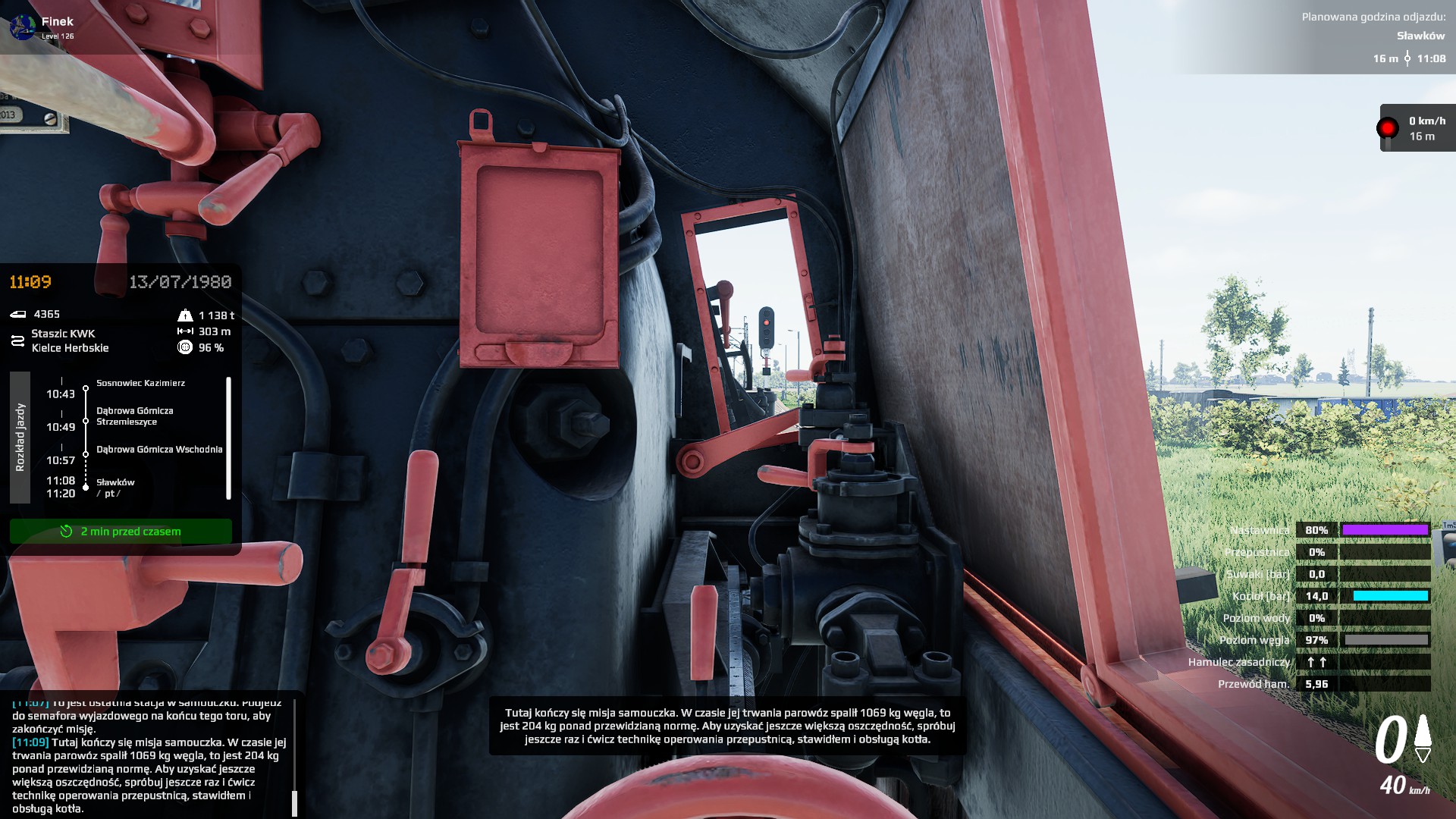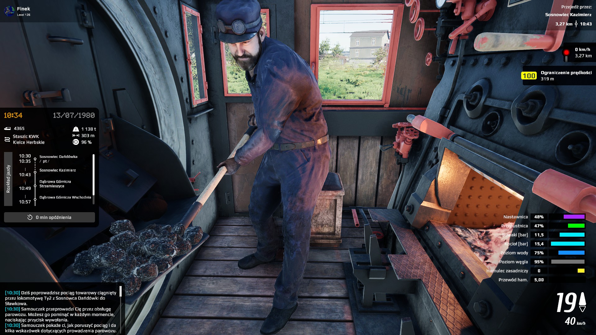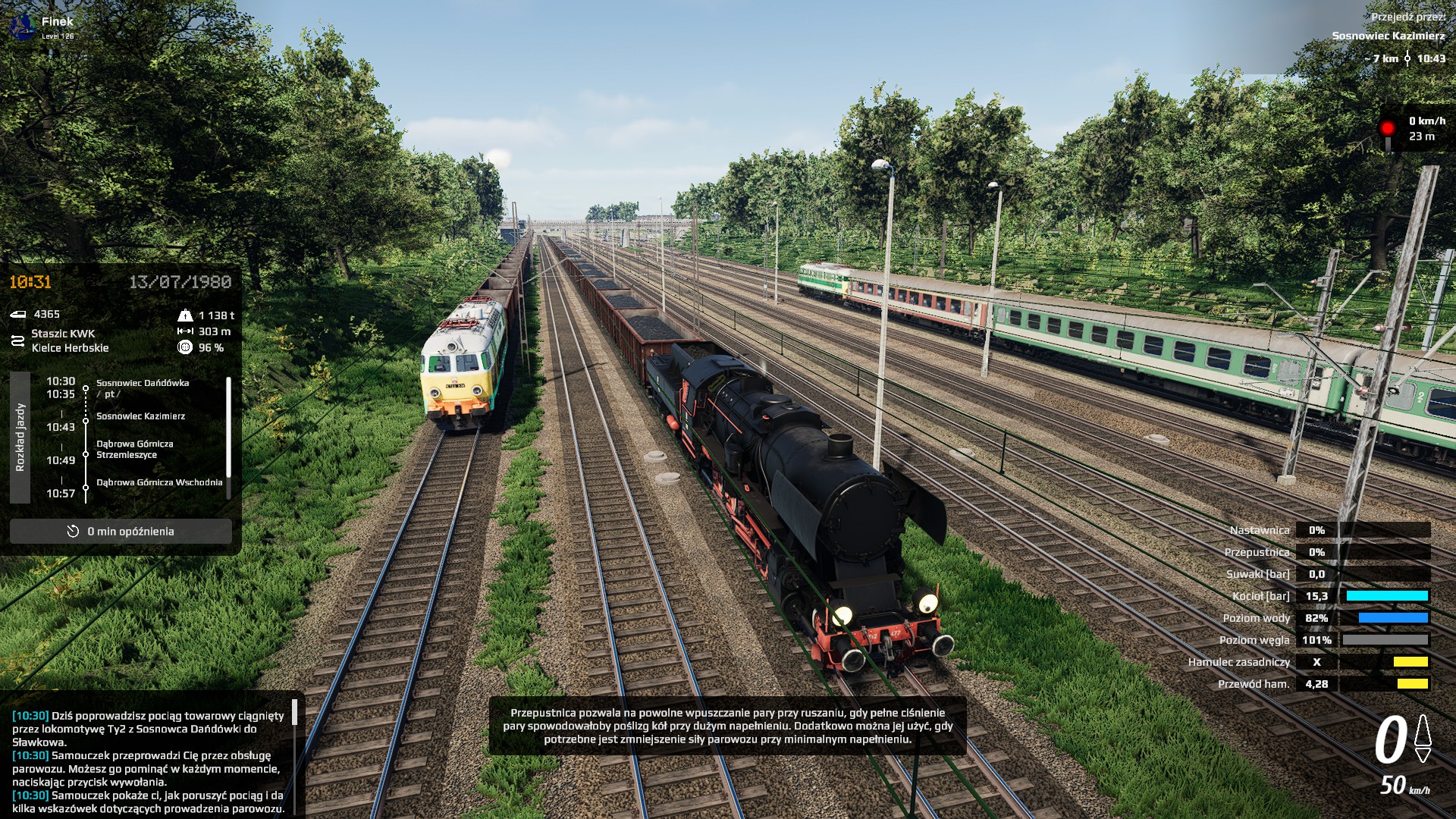 Palacz czy maszynista? Może palacz i eksplozja kotła? Nie... Maszynista... Ja trudny scenariusz (ilość wagonów)? Może średni na początek. Start. Zaczyna się dobrze. Uczą mnie obsługi, są pociągi AI. Zapowiada się dobrze