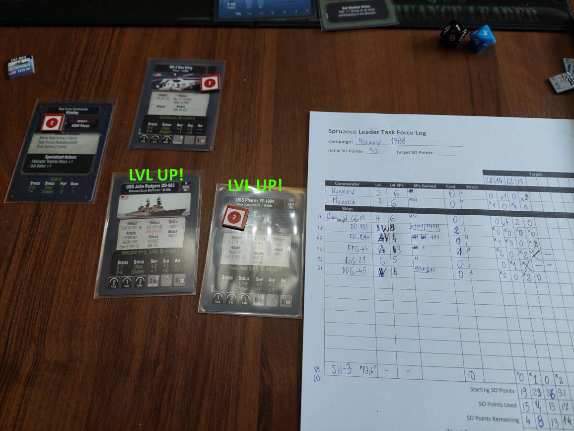 Z pokładu śmigłowca spuszczono sonar zanurzalny i uzyskano kontakt z oddalającym się okrętem podwodnym, prawdopodobnie uszkodzonym. Przeprowadzono atak z użyciem obu podwieszanych torped, uzyskując potwierdzone zatopienie wrogiego okrętu.