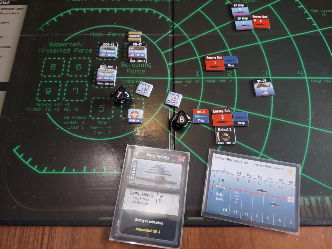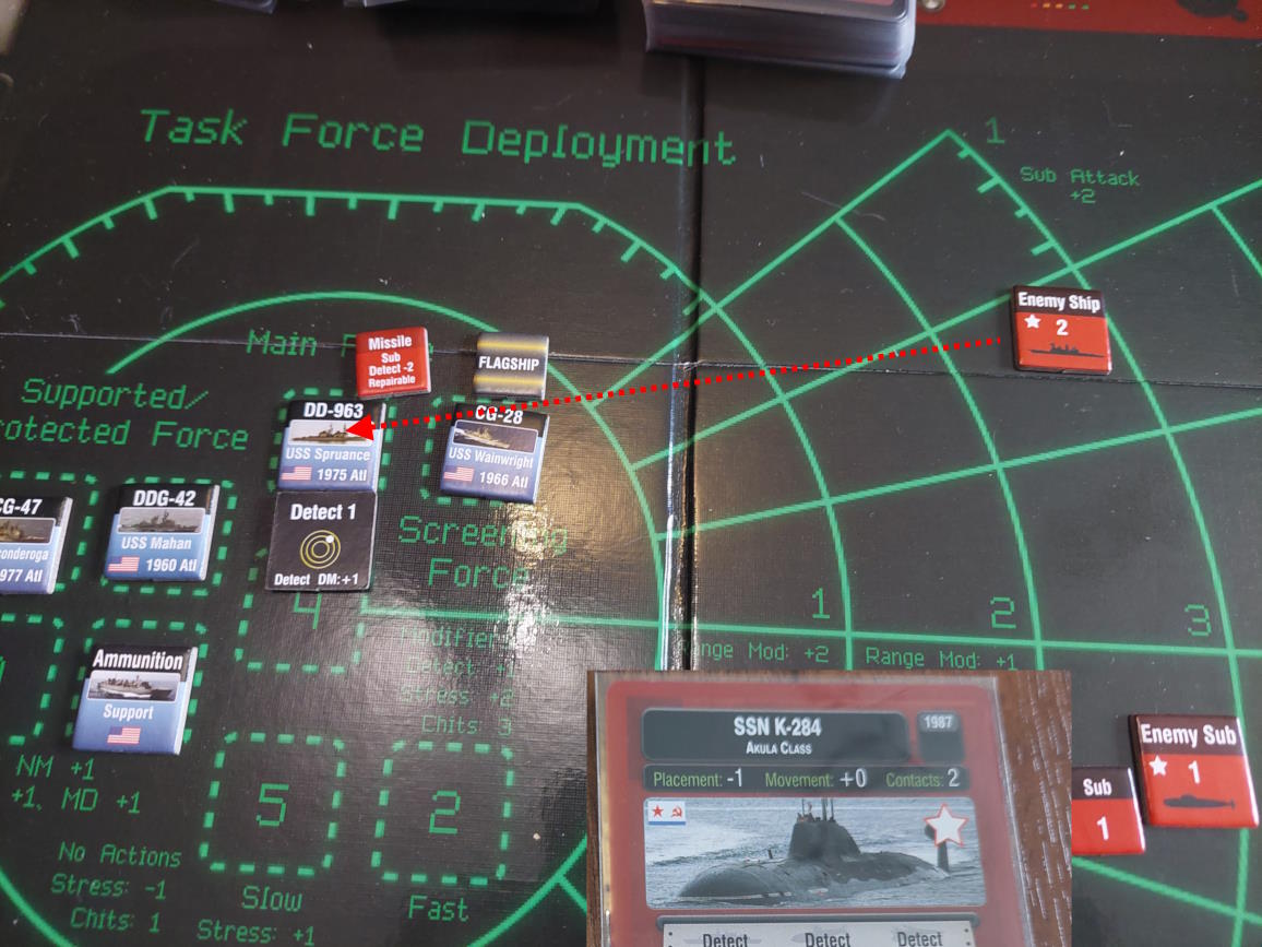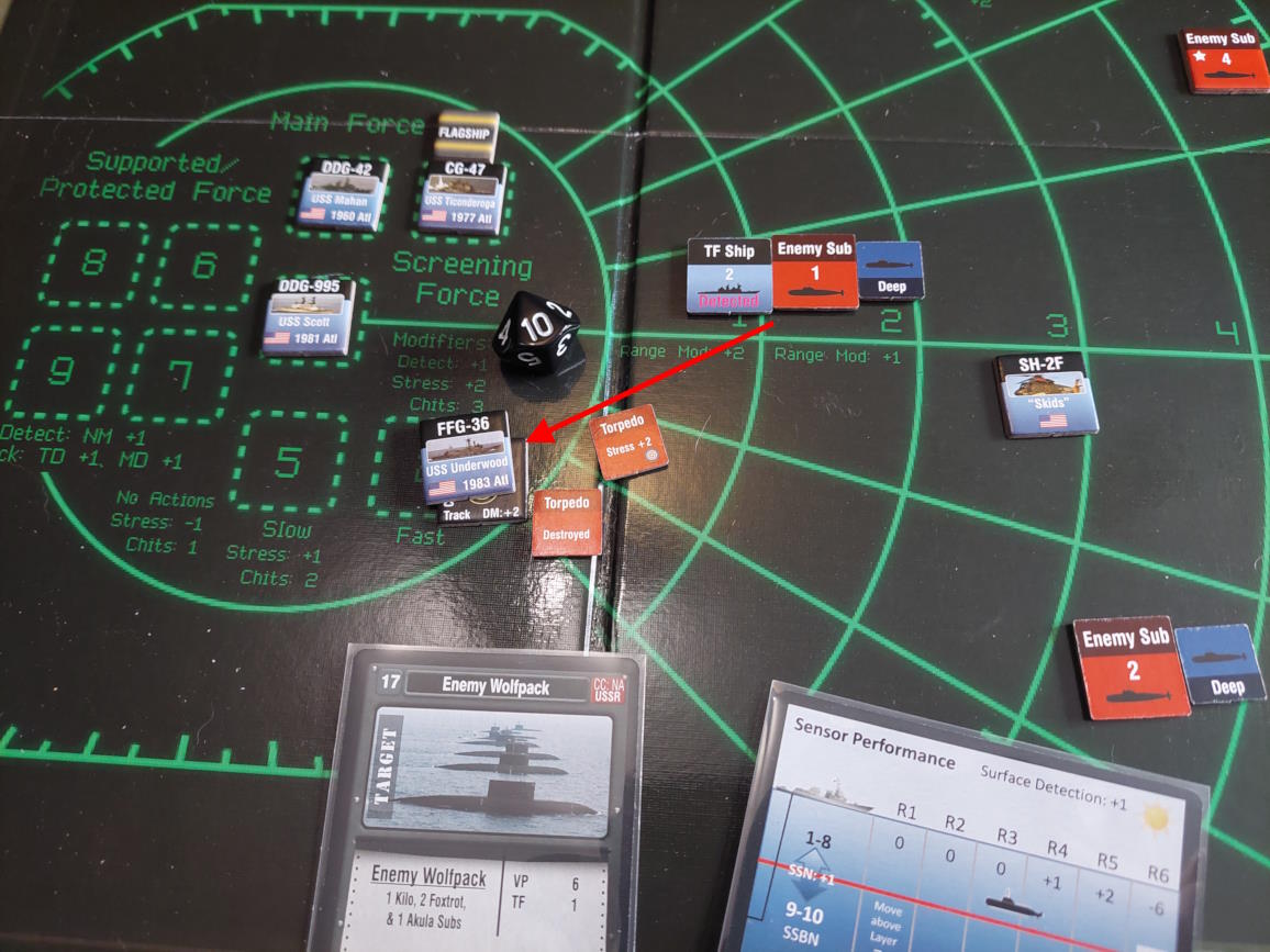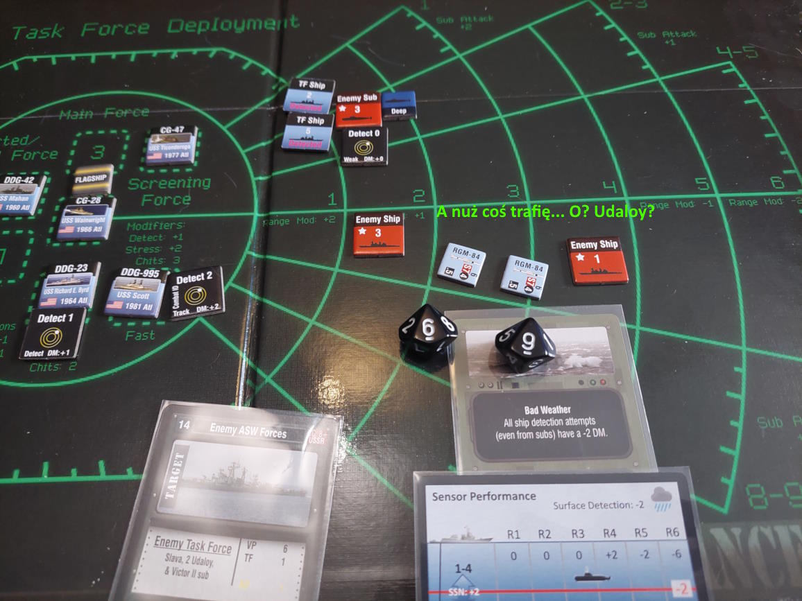 Okazał się to najgorszy pomysł na jaki wpadł kapitan. USS Ticonderoga wykrył okręt podwodny i wspierając się sonarem aktywnym uzyskaliśmy dokładny namiar na okręt podwodny klasy Foxtrot podchodzący pod nasz zespół. Mieliśmy jeszcze sporo torped i USS Scott prowadził zmasowany atak na foxtrota, zatapiając jednostkę.