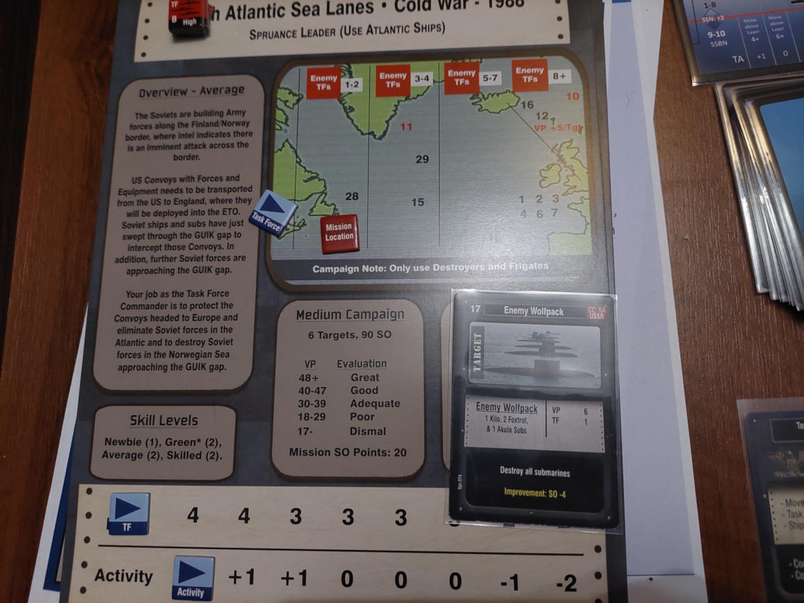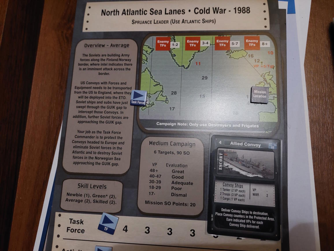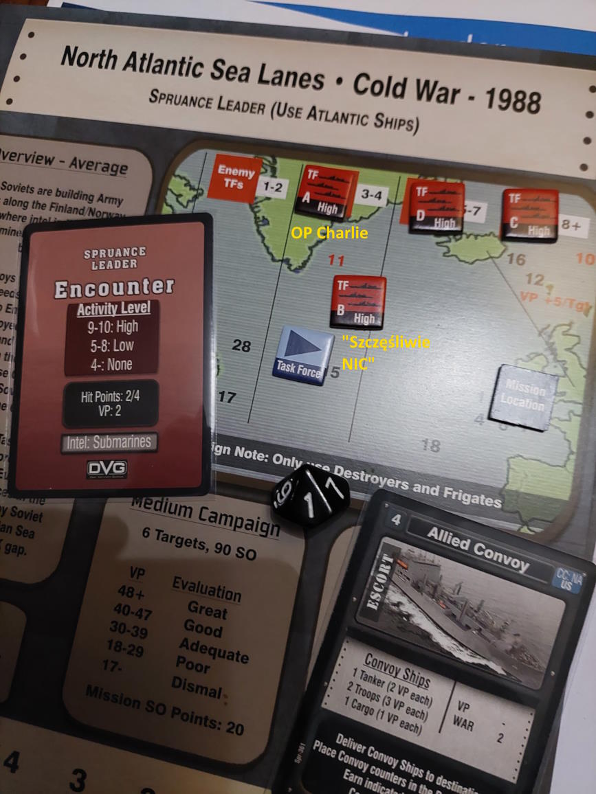 Mijaliśmy właśnie Ławicę Nowofunlandzką, gdy odebrałem nowe rozkazy. Mińsk, lotniskowiec wroga, nie kieruje się na południe, a czeka na konwój, który zmierza z południa. Sowieci najwyraźniej pozyskali jakieś cenne zasoby z południa i starają się je przetransportować na drugą stronę Atlantyku. Z zespołu Mińska odłączył się krążownik rakietowy typu Slava i niszczyciel i mają spotkać się z zespołem. Dowództwo nie dba o konwój. Mogą go zatopić okręty podwodne i lotnictwo. Naszym głównym zadaniem jest pozbycie się okrętów sowieckich, aby można było rozgromić bezbronny konwój... Oczywiście zatopienie konwoju jest też mile widziane...