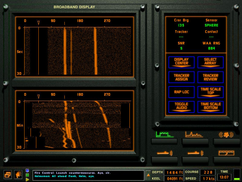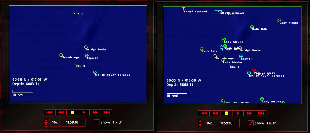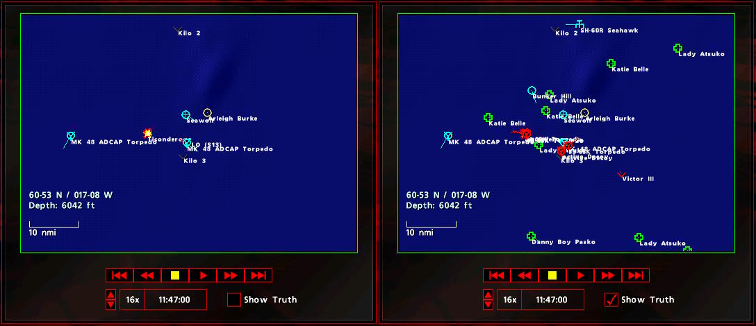 Była 10:17, gdy operator sonaru zaklasyfikował jeden z kontaktów jako potencjalny okręt podwodny klasy Kilo. Finek rozkazał wystrzelić torpedę ustawiając jednak jej górny pułap poniżej 80 stóp... Okręt podwodny na głębokości peryskopowej i statki handlowe powinny być bezpieczne... A okrętów podwodnych spodziewał się niżej... Obrazek z lewej pokazuje jak ja widziałem kontakty, ten z prawej z "show truth" to obraz prawdziwy
