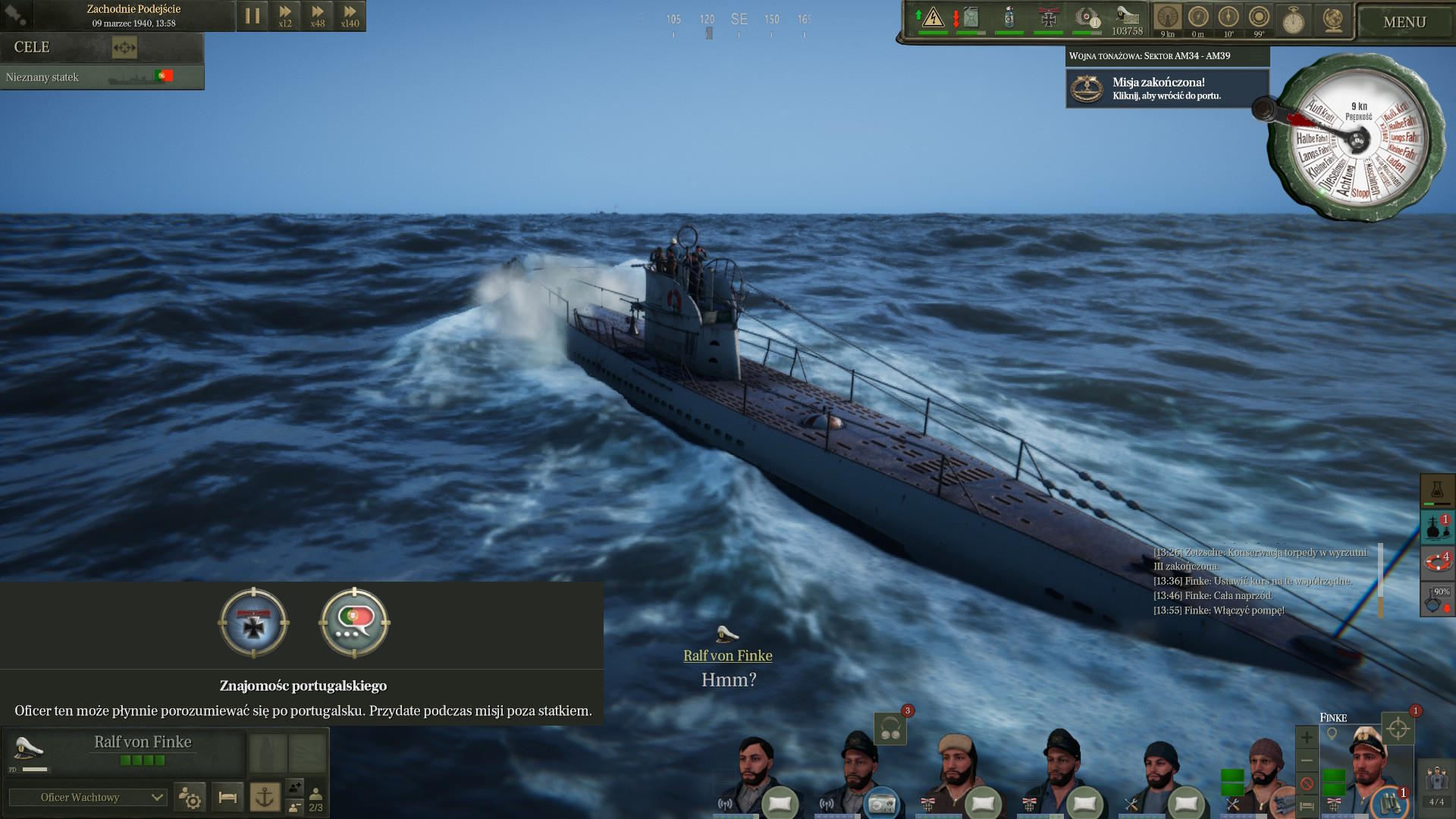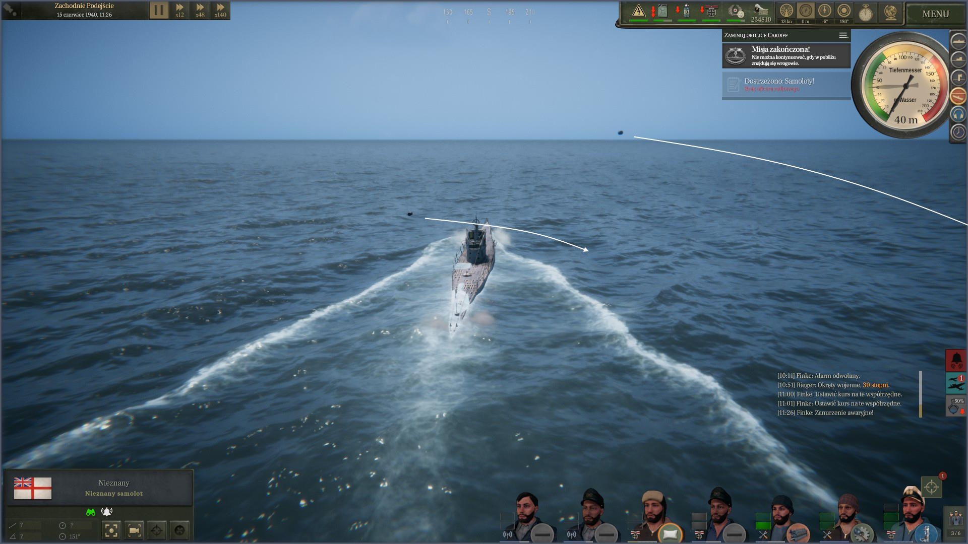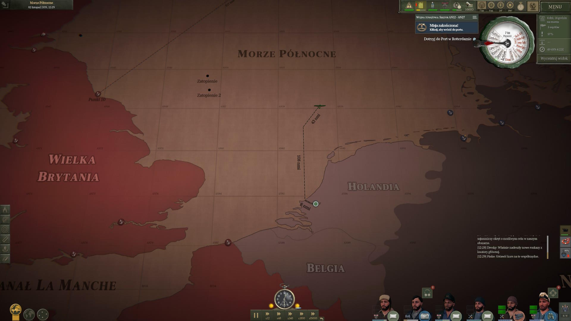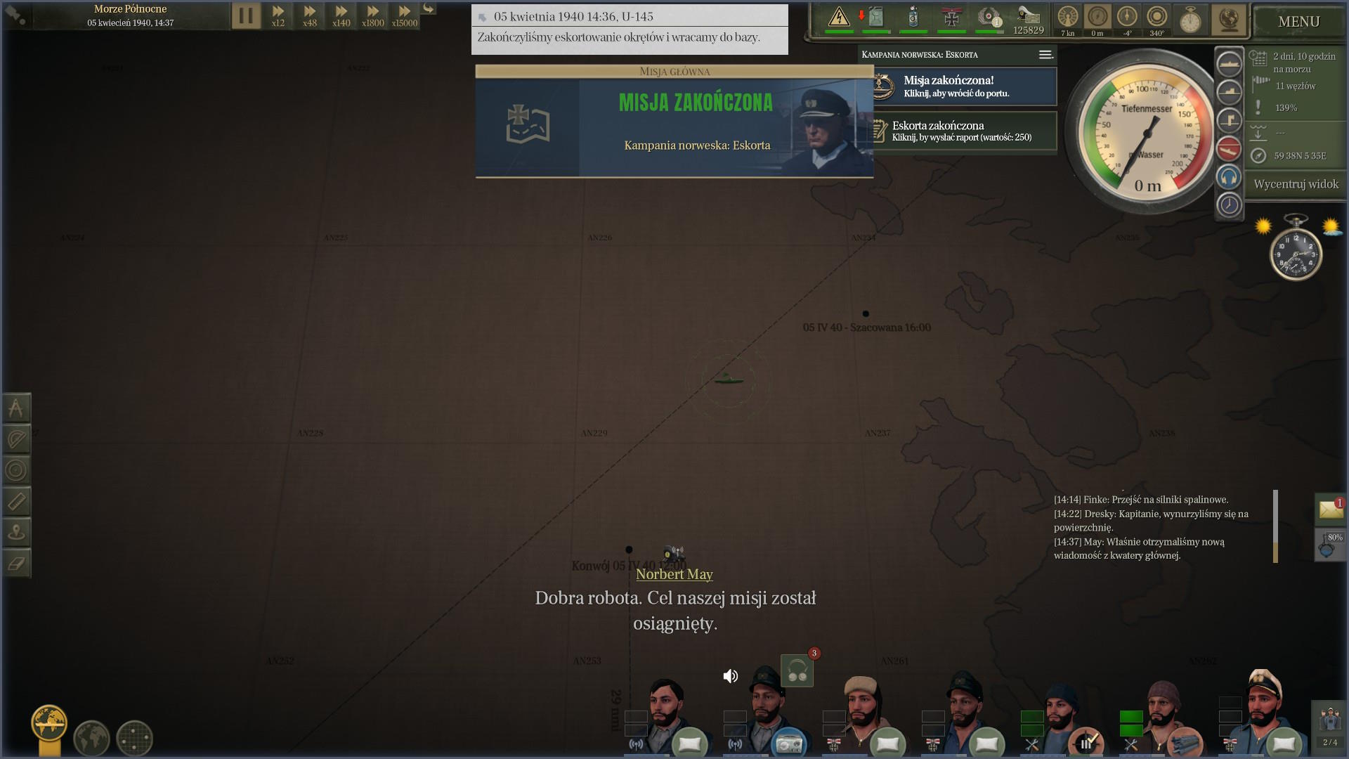 Już zacząłem planować i liczyć ile paliwa możemy zużyć na polowanie na Północno Zachodnim podejściu, gdy nadeszła wiadomość z rozkazami. Wróg wykrył naszą misję i rozpoczął polowanie. Miałem natychmiast wracać do portu