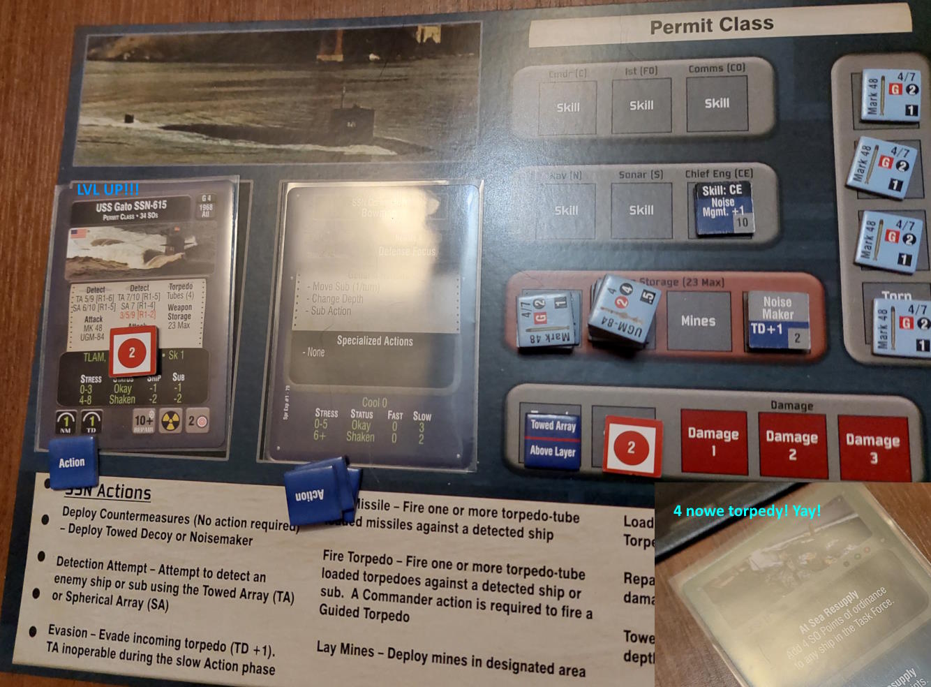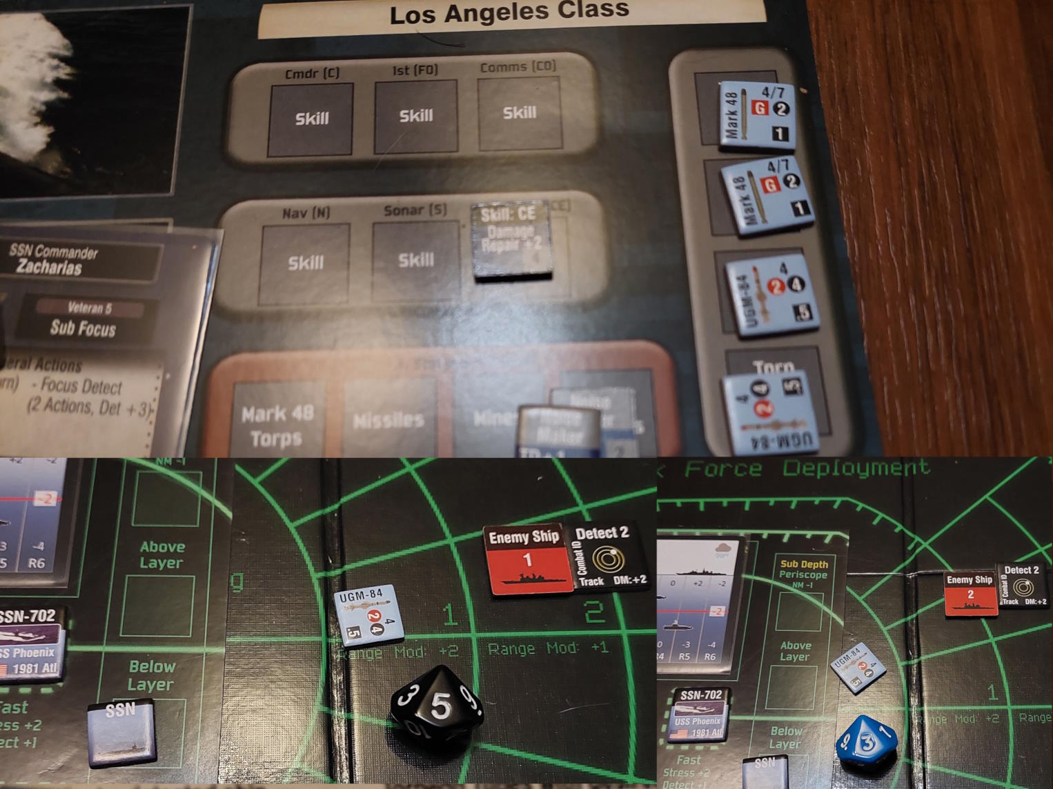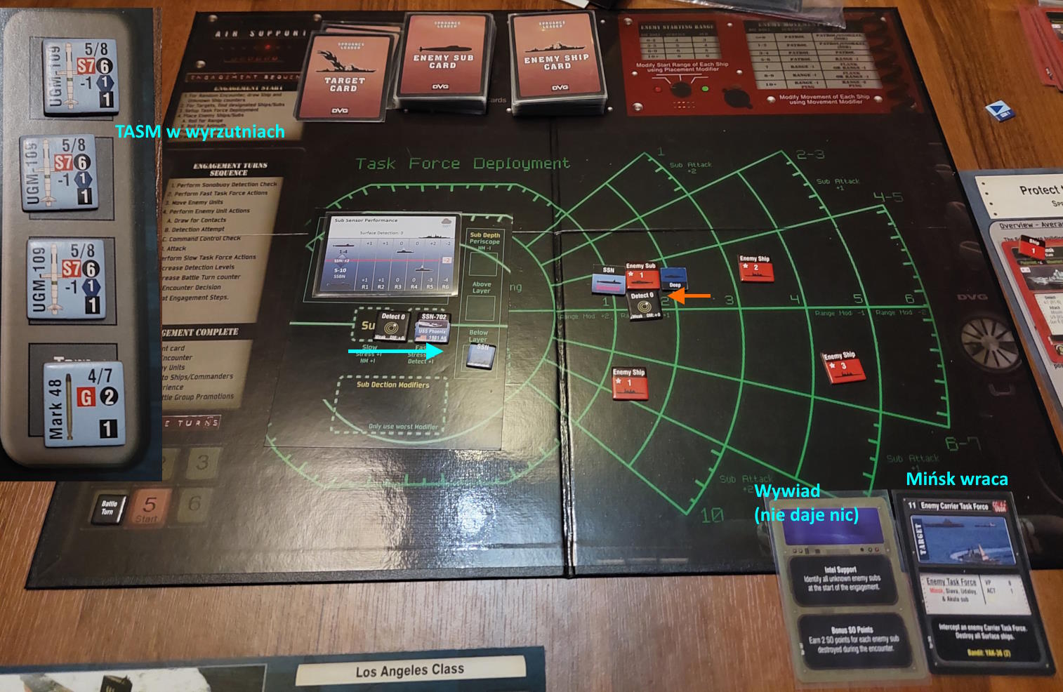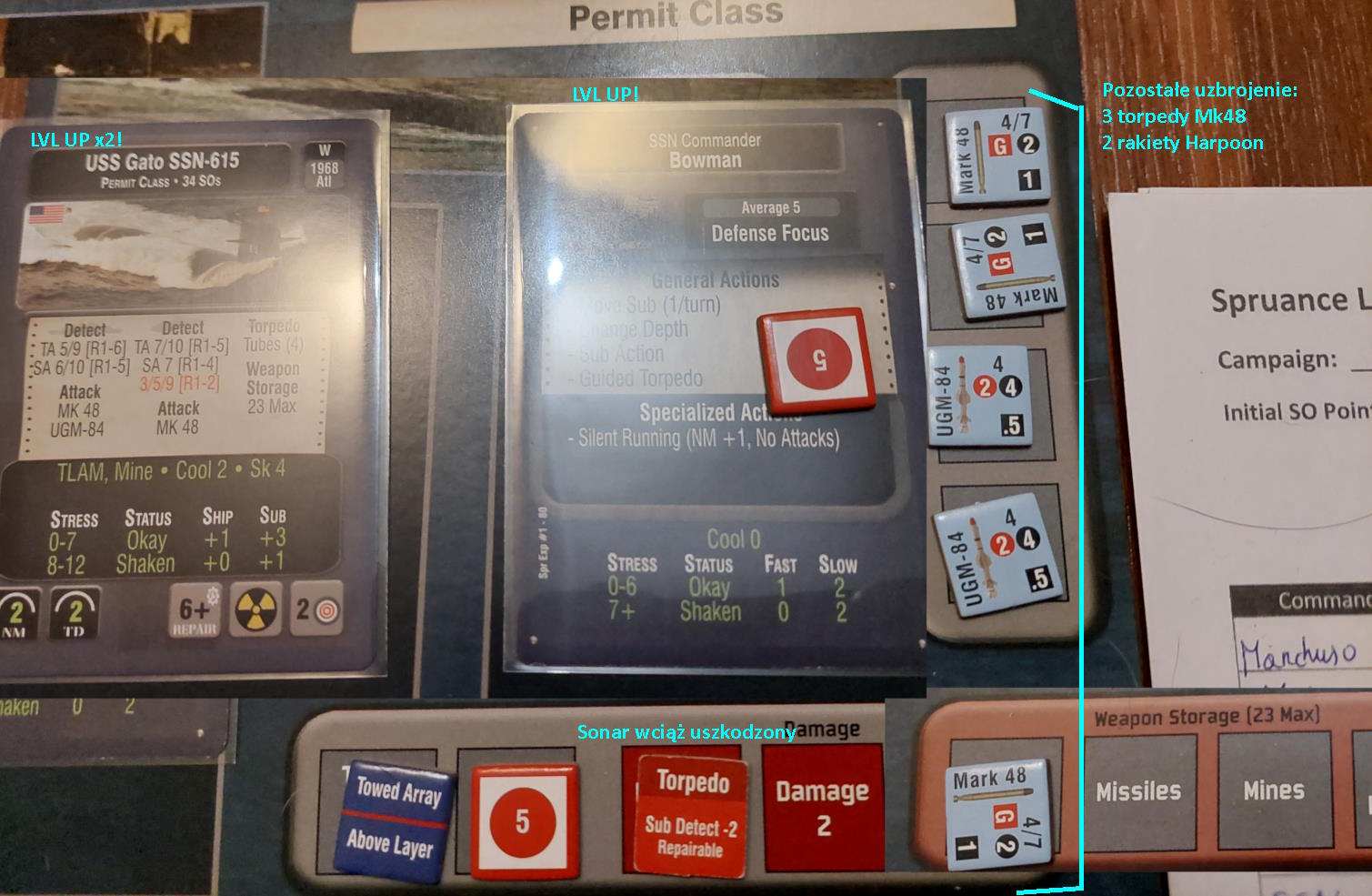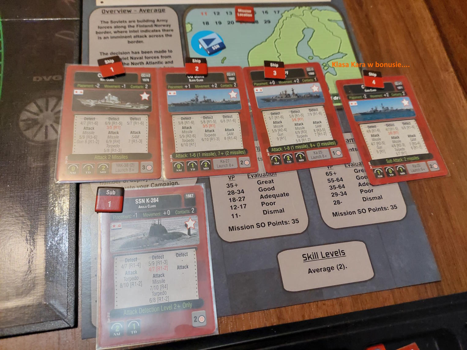 Kampania składa się z 4 wyjść okrętów podwodnych. Pierwsze z nich zakończyło się totalną porażką. Za USS Dace otrzymuję nowy okręt z niewyszkoloną załogą... Ale ma jeszcze drugi okręt (USS Phoenix, klasa Los Angeles, kapitana Zachariasa), który stanowi moją podstawę. Niemniej karta sowieckich OP zostaje w grze dając mnie kary do zaopatrzenia, aż sowietów nie pokonam. Na razie mam wynik 0 i szanse na wygraną zmniejszają się