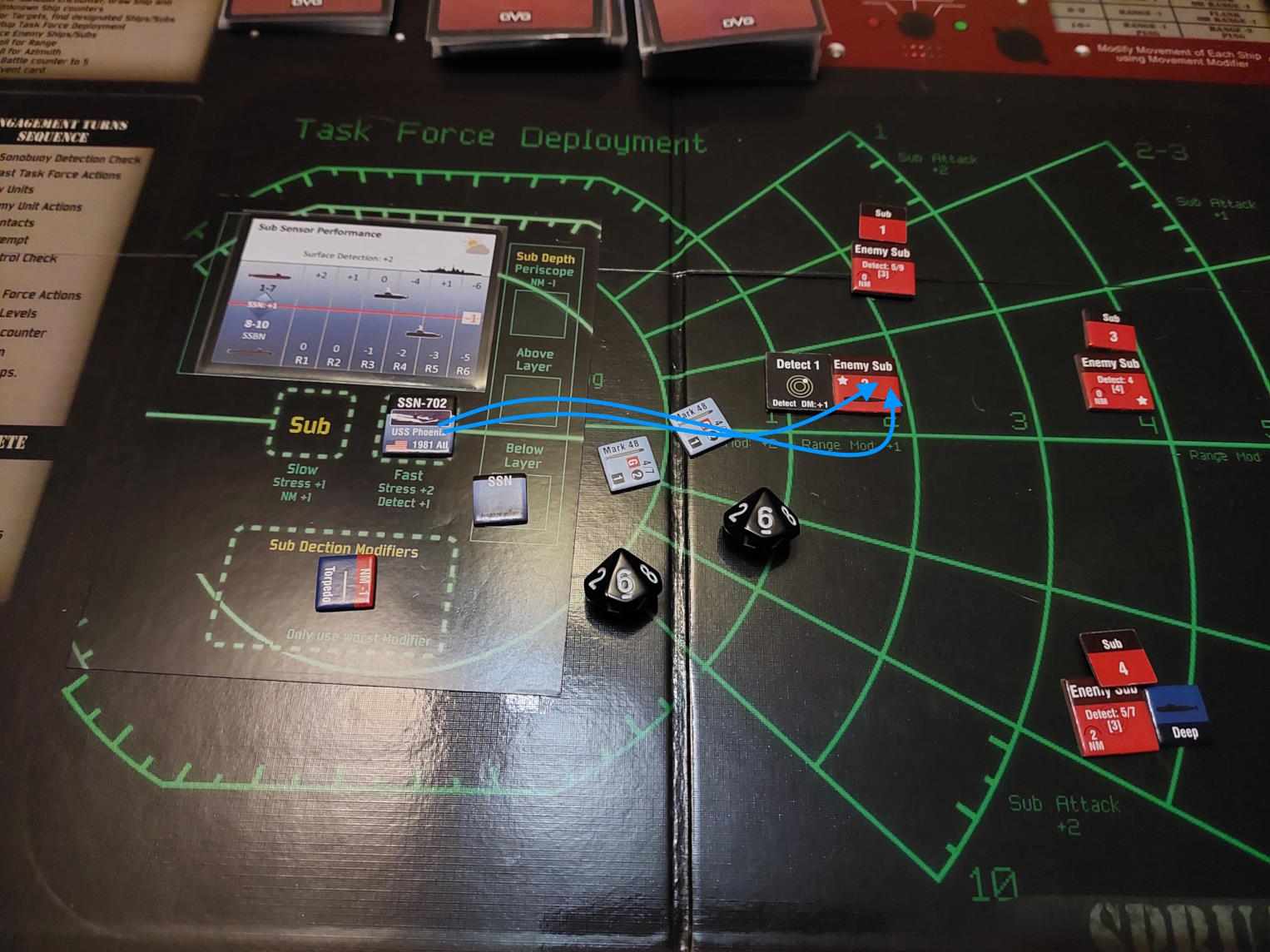 Okręt jest w pozycji "wolna". Ma premie do ukrycia, ale jego akcja jest po sowieckich. Wliczając kapitana, okręt ma 1 akcję przed sowietami i 3 akcje po nich. Alternatywnie mógłby mieć akcję przed Sowietami i premie do wykrycia nieprzyjaciela