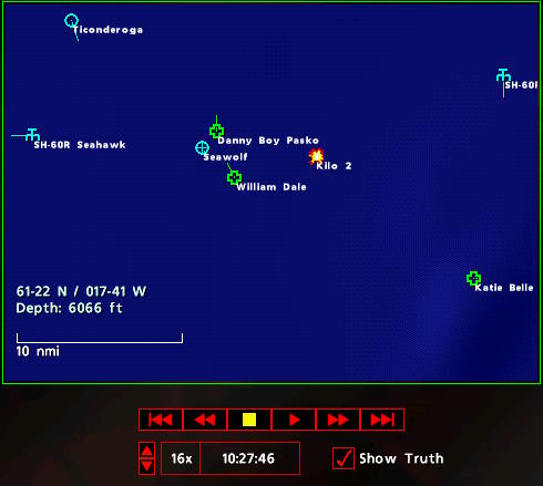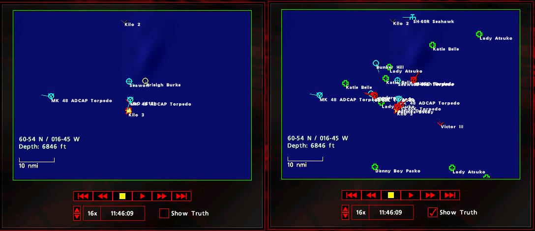 Była 10:17, gdy operator sonaru zaklasyfikował jeden z kontaktów jako potencjalny okręt podwodny klasy Kilo. Finek rozkazał wystrzelić torpedę ustawiając jednak jej górny pułap poniżej 80 stóp... Okręt podwodny na głębokości peryskopowej i statki handlowe powinny być bezpieczne... A okrętów podwodnych spodziewał się niżej... Obrazek z lewej pokazuje jak ja widziałem kontakty, ten z prawej z "show truth" to obraz prawdziwy