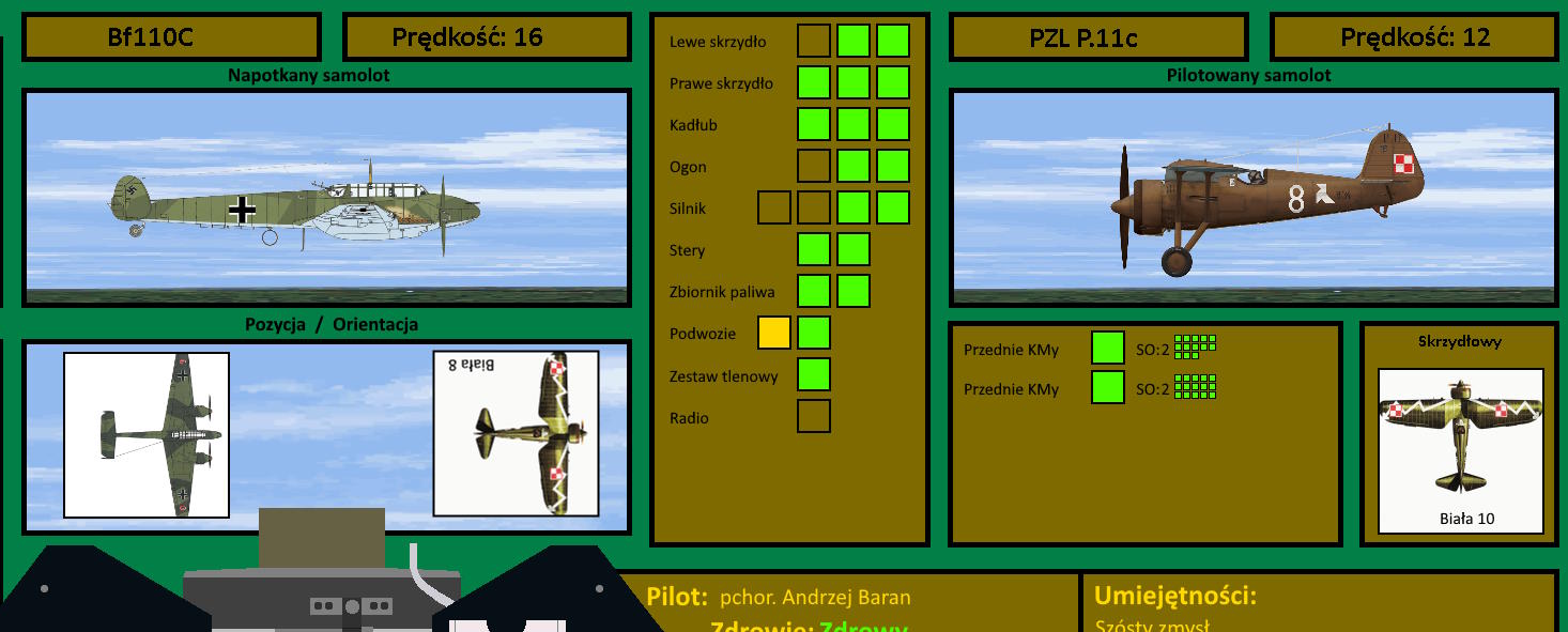 Niemcy znów przystąpili do ataku. Andrzej wił się myśliwcem we wszystkie strony, gdy obramowywały go pociski smugowe, ale nie wszystkie udało się wyminąć. Każdy z nich, wbijając się w konstrukcję samolotu wstrząsał konstrukcją, ale najgorszy cios nadszedł, gdy oprócz wstrząsu nastąpił efekt. Z silnika poszły iskry i za samolotem Andrzeja pojawił się biały dym... Chłodziwo z silnika zaczęło uciekać, co zwiastowało kłopoty... A Niemcy kontynuowali swoje ataki... W ułamku przerwy rozejrzał się, ale nie mógł dojrzeć Leopolda. Nagle mignął mu po prawej stronie... Czy Niemcy atakowali tylko Andrzeja, czy też Leopold również był postrzelony... Kierując się ku niemu mógł go wystawić Niemcom, ale wymagałoby to skierowania się w bardziej przewidywalną stronę... A Me110 ruszał do kolejnego ataku...