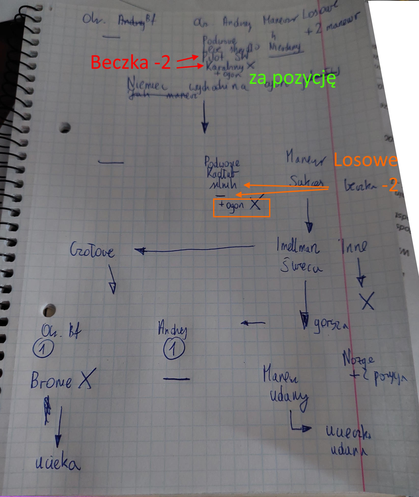 Dostrzegł go po lewej. Był z dala od Andrzeja i chyba nabierał wysokości, stawiając Niemców w sytuacji, że mogli zaatakować Andrzeja, ale przez co Flanek zyskałby nad mini przewagę, albo mogli ruszyć na Flanka, ale wówczas musieliby zostawić Andrzeja. Niemcy chyba jednak uznali, że lepszy jest wróbel w garści i trójka Messerschmittów znów zanurkowała w stronę uszkodzonego samolotu...