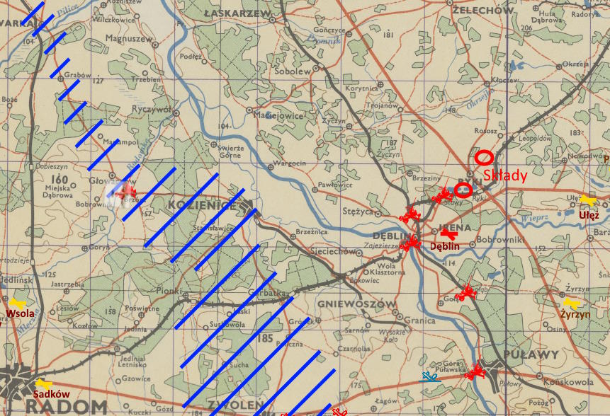 Ludwik zbliżał się do mostu, którym tyle razy przekraczał Pilicę, ilekroć kierował się do Warszawy ze swych rodzinnych stron. Nieopodal był most kolejowy i tu drogi rozchodziły się. Kolej zmierzała do Radomia, a droga biegła do Kozienic. Każda stanowiła potencjalną drogę, którą mogły poruszać się siły nieprzyjaciela. Tylko, którą wybrać... Rozmyślanie przerwał ogień, który odezwał się od strony mostu drogowego. Ludwik widział tylko lecące w jego stronę pociski smugowe. Komuś najwyraźniej nie podobało się, że lata nad Warką.