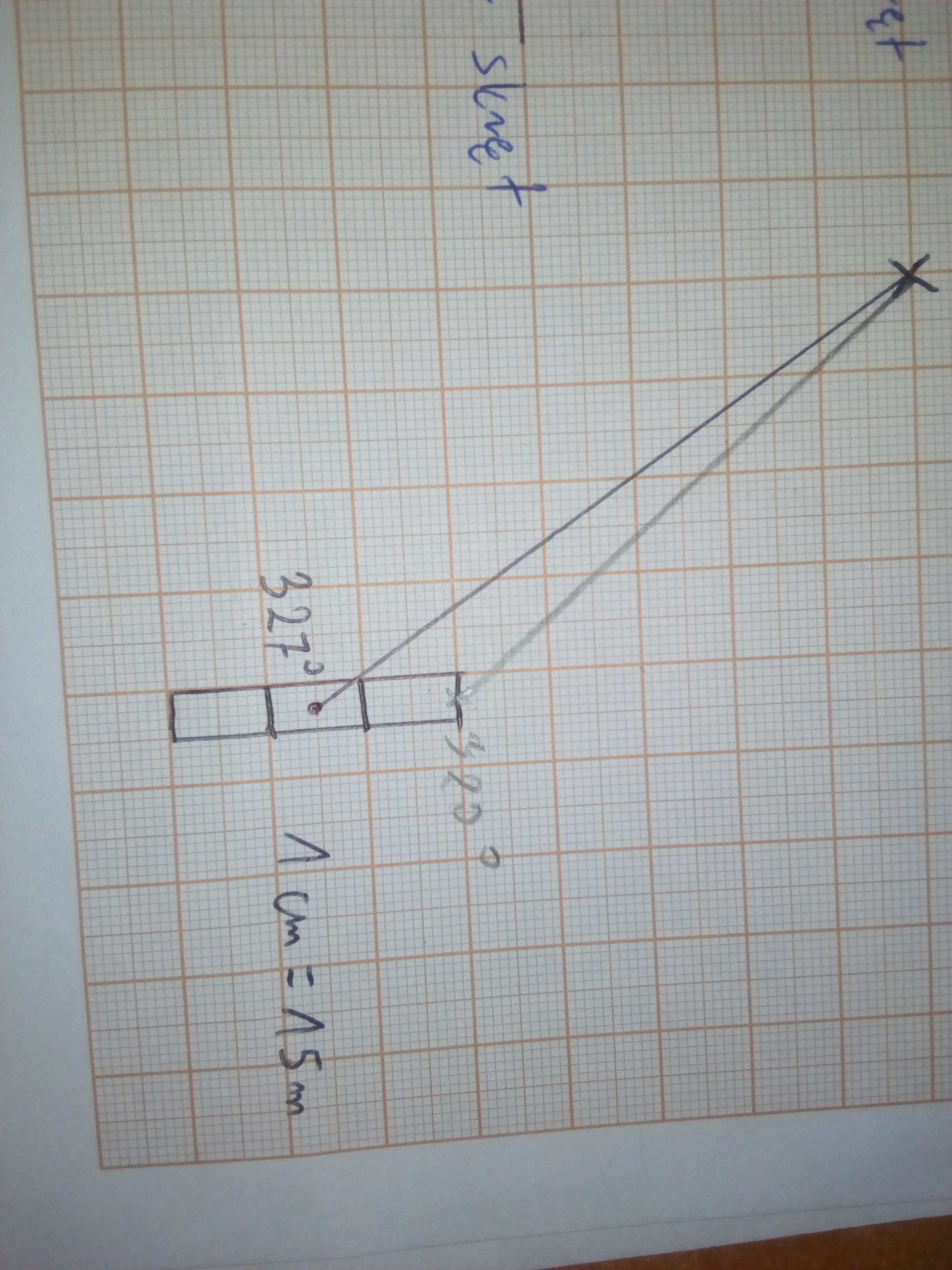 Trójąt czerwony ma podstawę D+zielona odległość (znana) i kąt z namiaru 327.