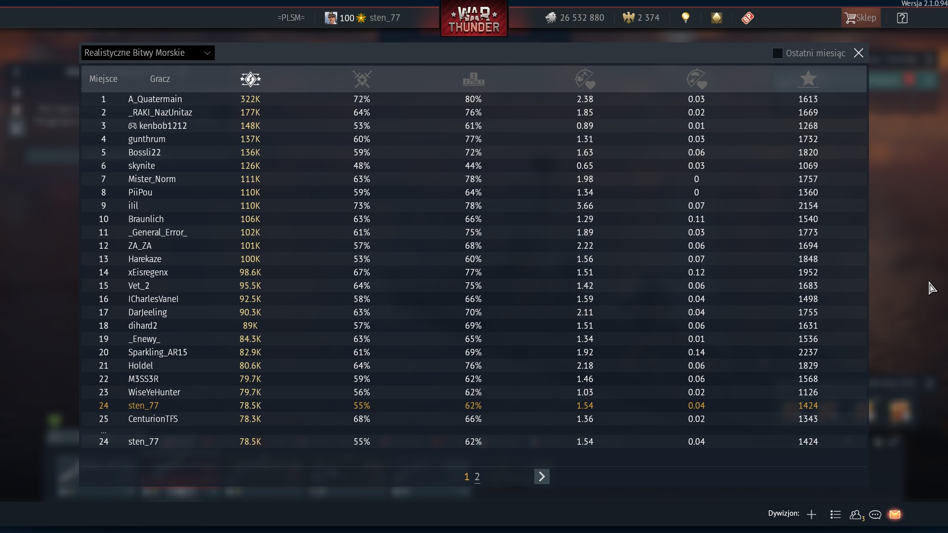 Dziś wskoczyłem na 24 miejsce w zabitych realistyk morskie oraz 24 miejsce klasyfikacji PvP na realistykach morskich :szampan