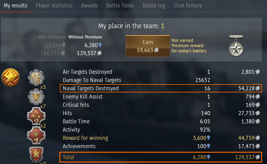 Ale zauważyłem, że i na morzu w WT działają te same algorytmy. Oto przykład - w jeden wieczór po 5-iu w miarę udanych bitwach (2-6 zatopień w bitwie, 2x pierwsze miejsce), w 6-tej, w nagrodę taki wynik - same asysty - 8 razy i 0 zatopień. :eek