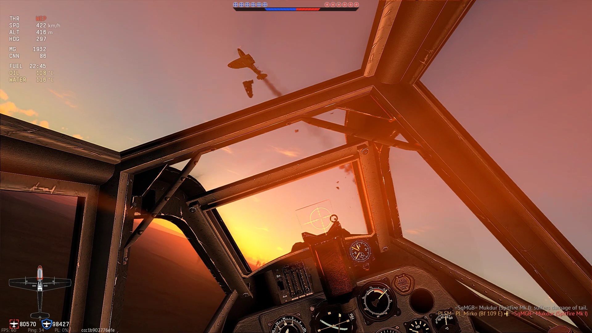 ... G-dwójka dosłownie zmasakrowana celną serią półcalówek mojego F6F-5. Po upływie 10-ciu - dosłownie dziesięciu sekund, rozbija się - efekt uszkodzeń, a gra nie zalicza mi fraga :sciana: