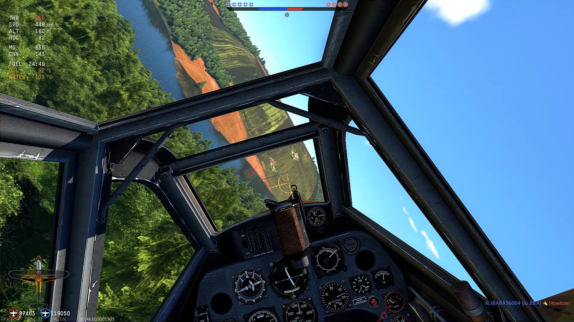 Za moment dostaję celną serię - pilot czyli ja wrzeszczy coś z bólu po niemiecku ... I zaczyna się walka o przeżycie - to co lubię - taniec niziutko, dosłownie czeszę korony drzew - przepustnica mojego T 16000M Hotas dostaje po ... skrzydełkach. W takich sytuacjach jako rudder sprawdzają się doskonale. Pociski śmigają dookoła, ale dzikimi manewrami utrudniam wręcz uniemożliwiam zadanie przeciwnikom.