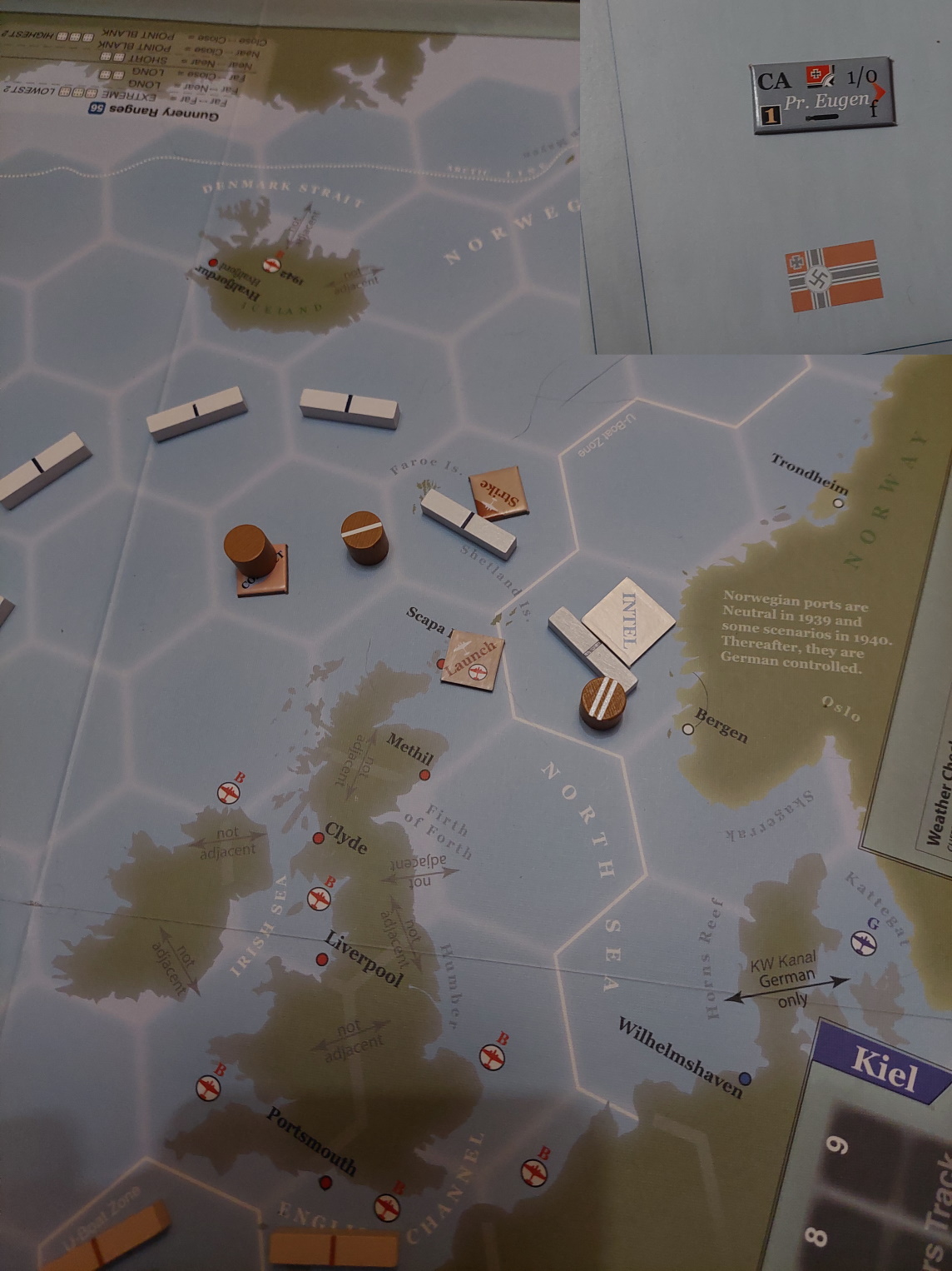 2 Eskadra Bojowa odnalazła okręty na Norweskich wodach. Okazało się, że to nie szukany pancernik, a Norweski patrol. Są mocno niezadowoleni z obecności naszych okrętów na ich wodach (a o Niemcach nie mieli). Ruszamy nasz zespół pomiędzy Wielką Brytanię i Islandię.