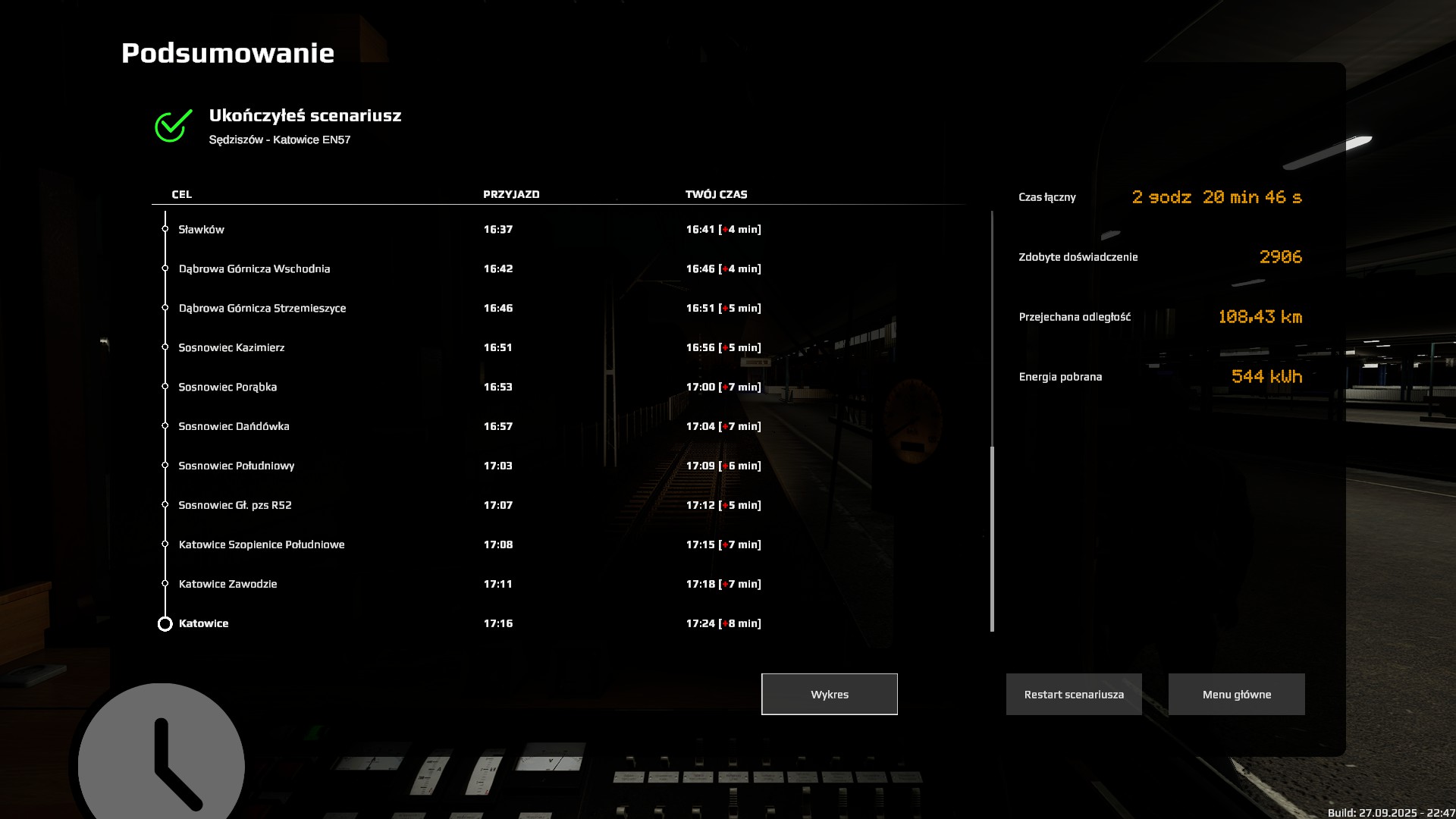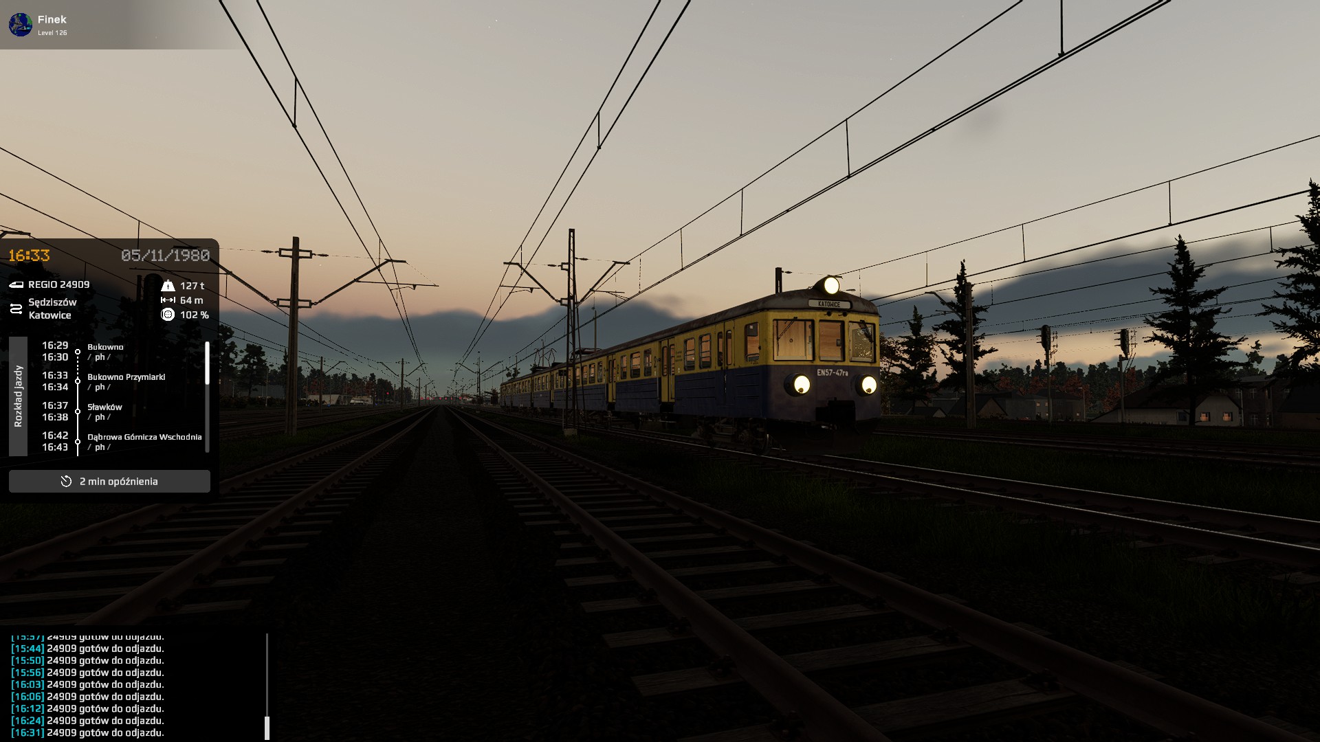 I dotarłem do końca z 38 minutami opóźnienia (a wyjazd z 33 minutami). Liczyłem na jeszcze osiągnięcie "Kiedyś dojedzie"...Ale go nie ma... Czyżby musiał to być serwer z większą liczbą graczy? Ale już raz myślałem, że to mam... Czyżby to musiał być scenariusz singlowy?