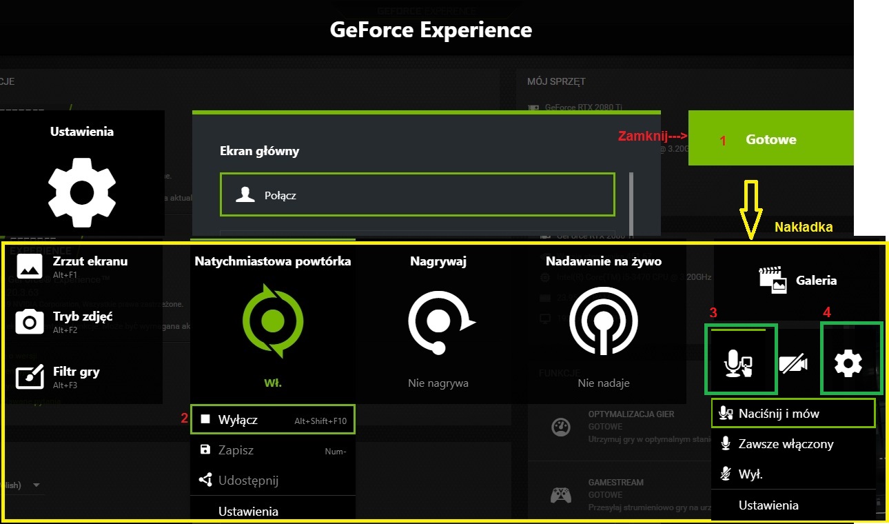 Jeżeli nie korzystasz z GF Experience zalecam zaznaczenie pola 2 "Sterownik graficzny NVIDIA" - instalacja tylko sterownika. Po instalacji GF Experience w pamięci rezyduje wiele modułów NV w tym interesujący nas "NVIDIA ShadowPlay helper". II. Pierwsze uruchomienie.