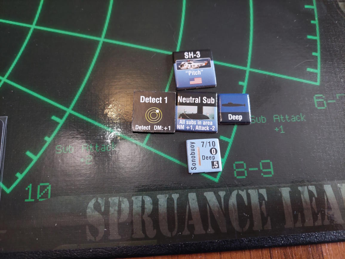 O 16:43 mój okręt flagowy stał się celem ataku. Ostatni Rosyjski okręt, rozpoznany potem jako Severomorsk przeprowadził atak na USS Wainwright, CG-28, uzyskując dwa trafienia. Uszkodzony został system kierowania ogniem, a druga z rakiet SS-N-14 Silex (prawdopodobnie) trafiła okręt w pobliżu wyrzutni rakietorped. To już nie były stateczki, teraz naszym przeciwnikiem byli prawdziwi sowieccy marynarze... Literówka na żetonie. Mój okręt otrzymał -2 do pociągania