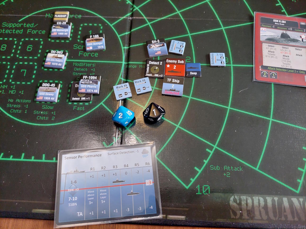 Z pokładu śmigłowca spuszczono sonar zanurzalny i uzyskano kontakt z oddalającym się okrętem podwodnym, prawdopodobnie uszkodzonym. Przeprowadzono atak z użyciem obu podwieszanych torped, uzyskując potwierdzone zatopienie wrogiego okrętu.