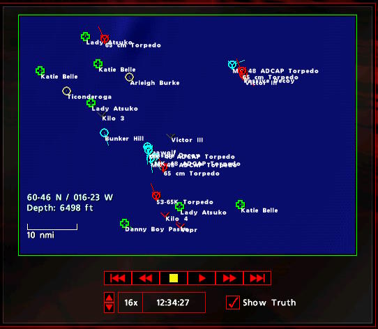 Była 10:17, gdy operator sonaru zaklasyfikował jeden z kontaktów jako potencjalny okręt podwodny klasy Kilo. Finek rozkazał wystrzelić torpedę ustawiając jednak jej górny pułap poniżej 80 stóp... Okręt podwodny na głębokości peryskopowej i statki handlowe powinny być bezpieczne... A okrętów podwodnych spodziewał się niżej... Obrazek z lewej pokazuje jak ja widziałem kontakty, ten z prawej z "show truth" to obraz prawdziwy