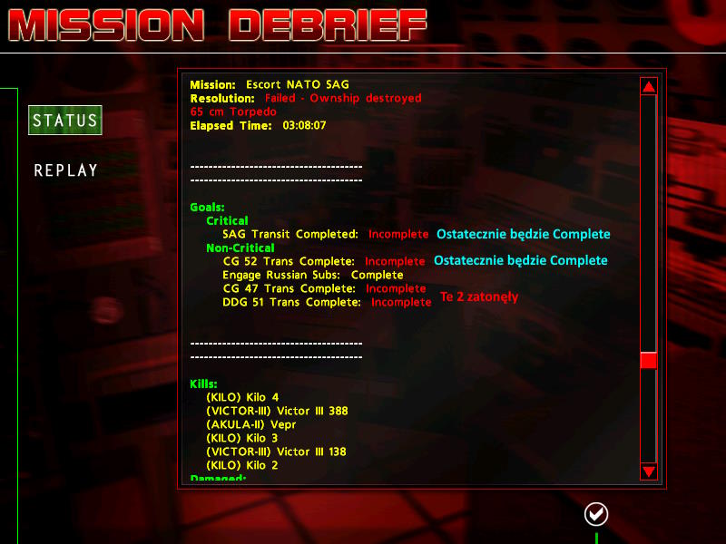A Finek musiał wczytać misję, gdzie miał Save z torpedą w odległości 2500 jardów... Po 10 próbach (i włączeniu "prawdziwych kontaktów na mapie") udało się spiralną ucieczką z 1400 stópw na powierzchnię zgubić torpedę i skończyć misję.... Bo powtarzanie tego piekła po raz kolejny Seawolfem to nie na moje nerwy.... (a jeszcze ta misja na 688(I) mnie czeka, choć tam misja może zakończyć się też sukcesem, jeżeli sowieci dadzą radę zatopić cały zespół... Po prostu 688(I) jest uznany za słabszy od Seawolfa i scenariusz zakłada, że sukcesu nie uda się powtórzyć...)