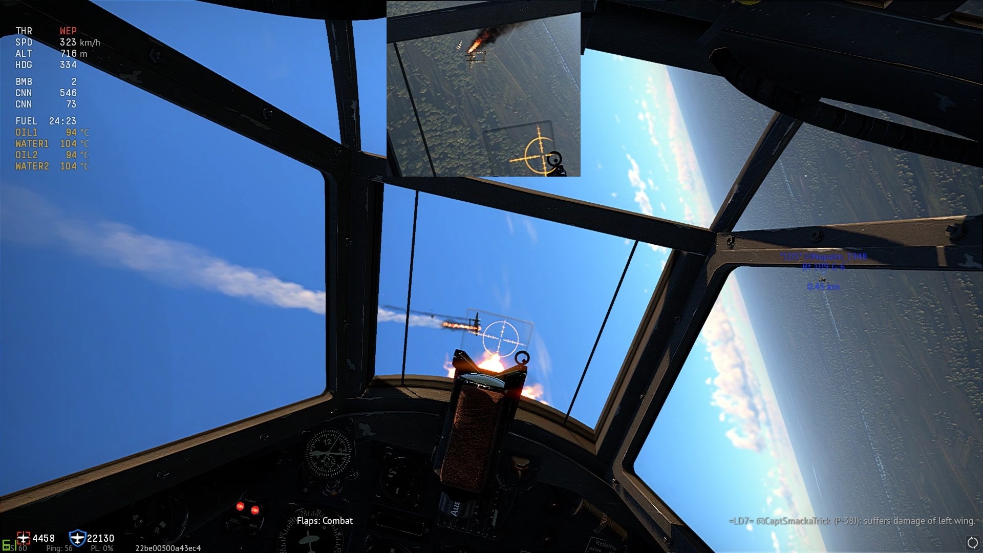 W kilka minut po dołączeniu do bitwy, trafiam na furball. Ratując kolegę z Team'u, "ściągam" z przednich działek P-38J. "A taki był ładny, taki hamerykański..."