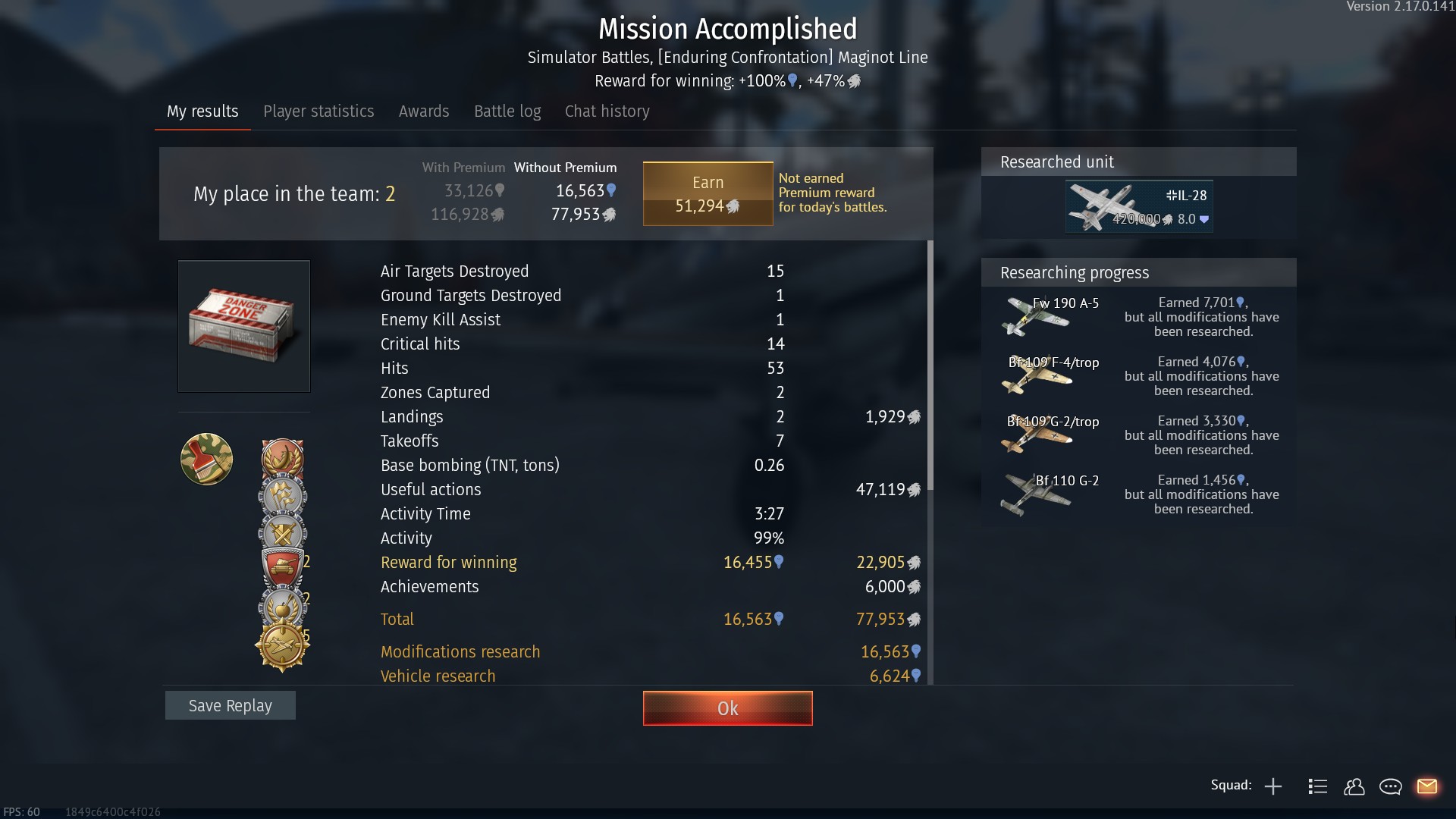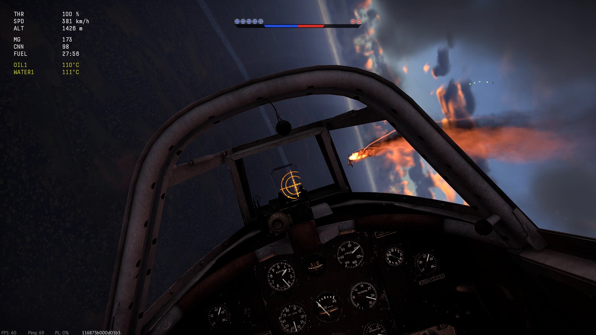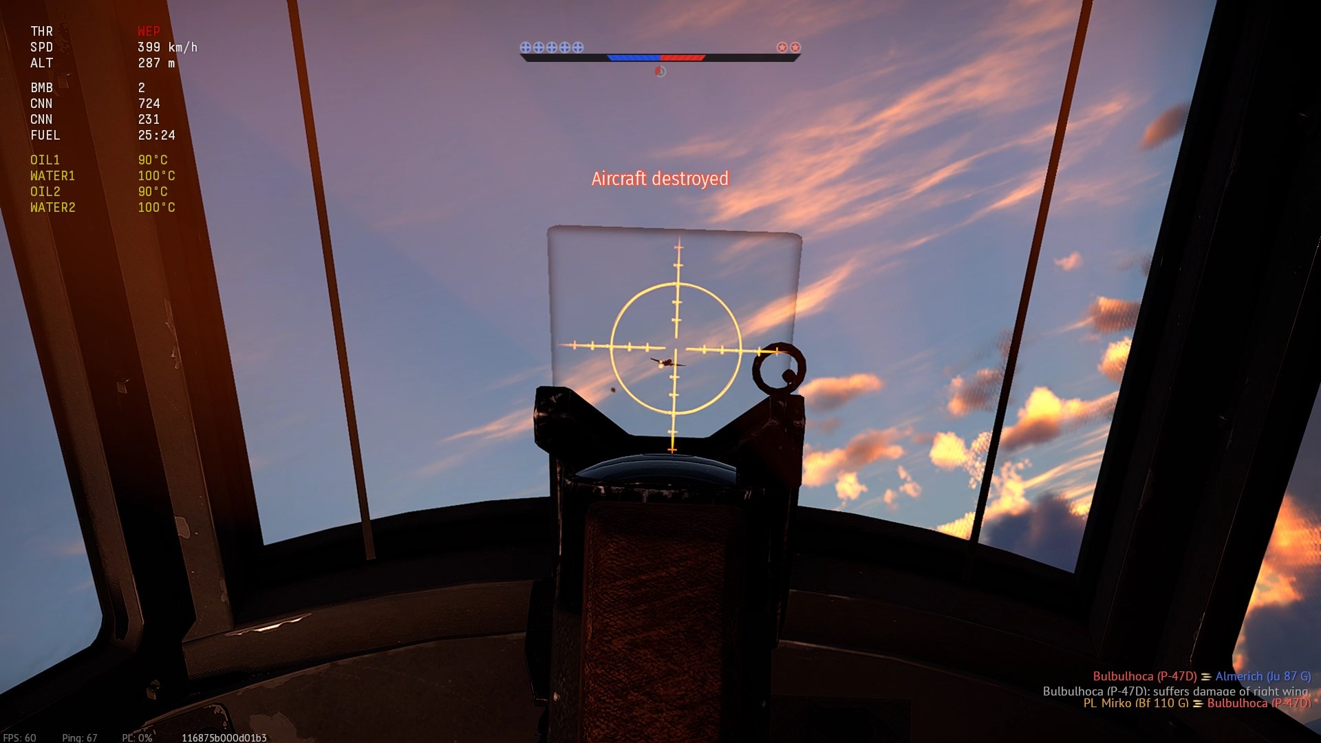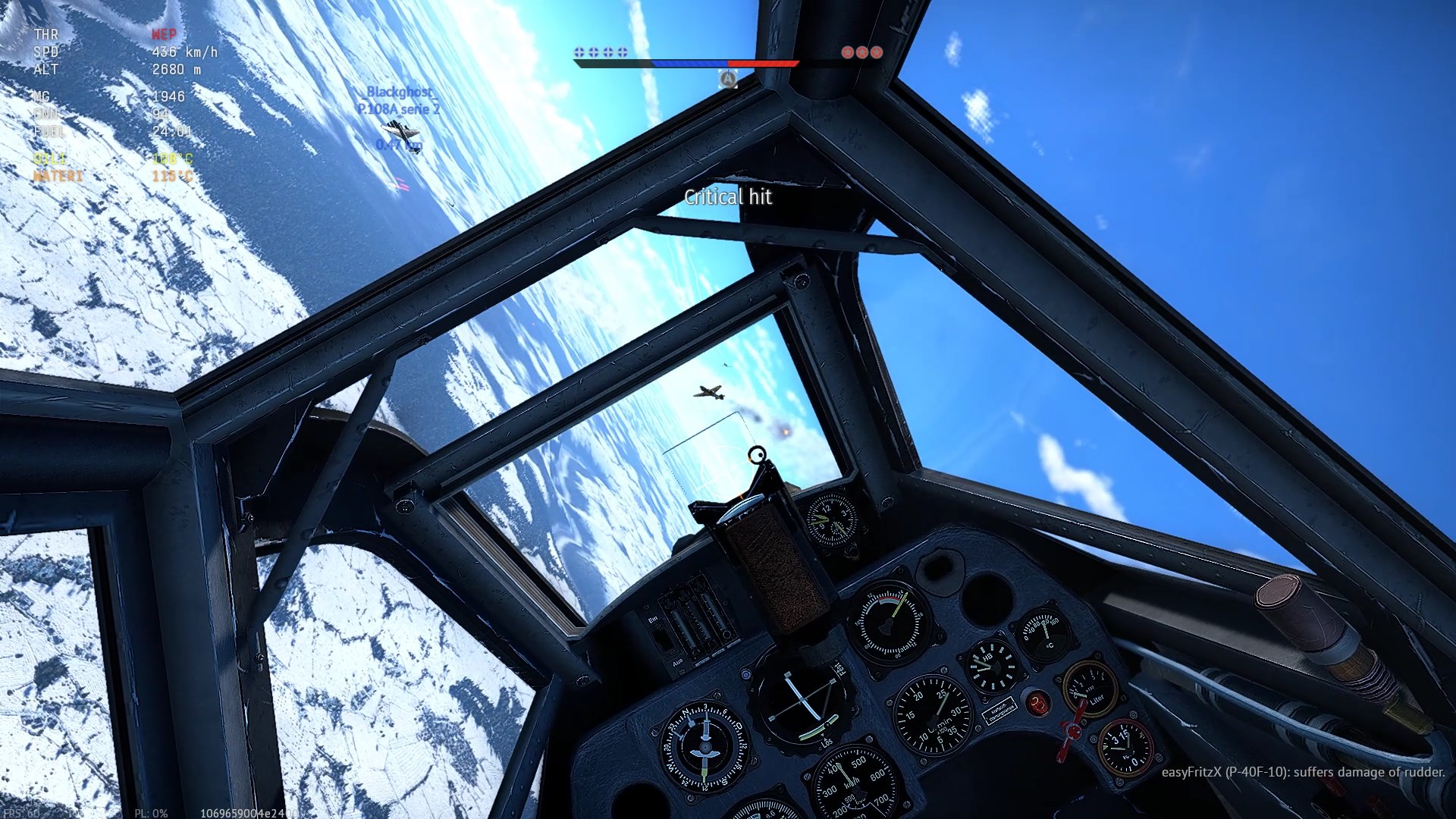 Po wizycie na lotnisku, nad zatoczką idę na H2H z przeciwnikiem. I robię "cajmerski" błąd - próbując rozpoznać wrogą maszynę zbyt długo zwlekam z unikiem - zostaję trafiony wachlarzem pocisków z 6-ciu połcalówek.