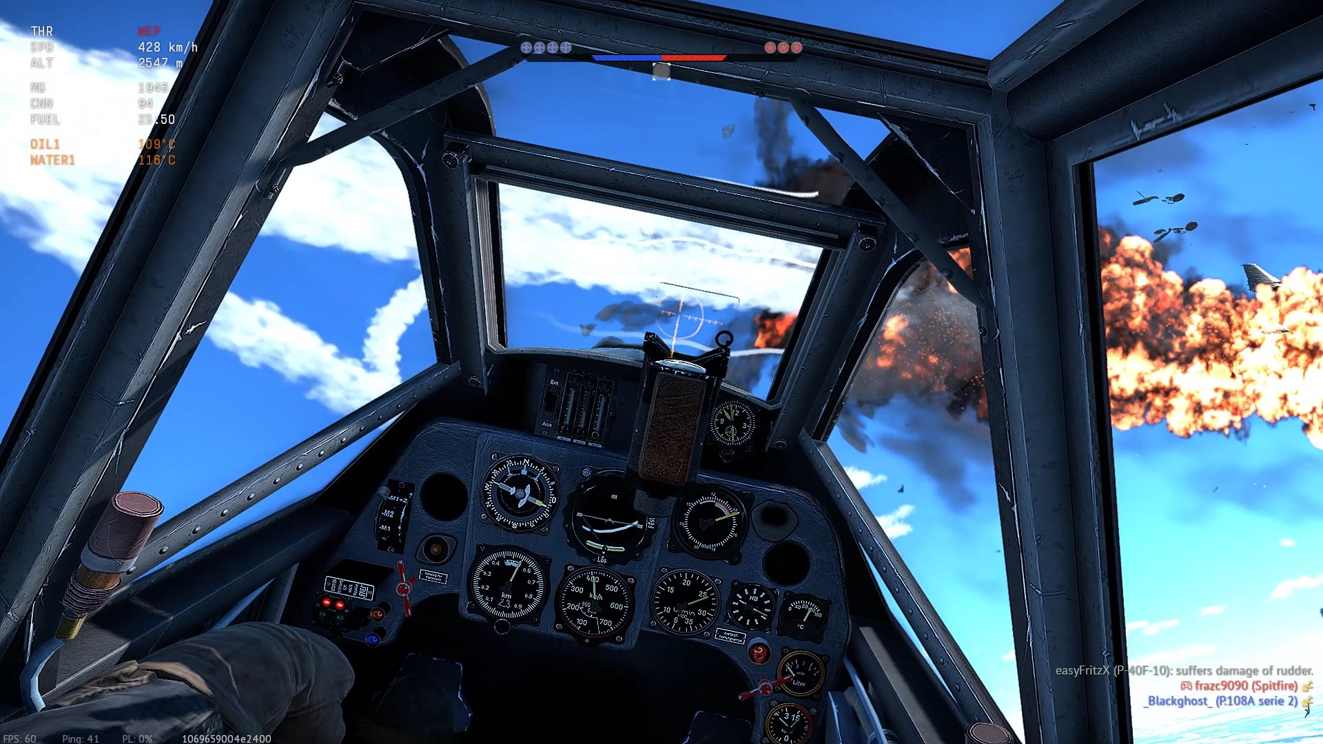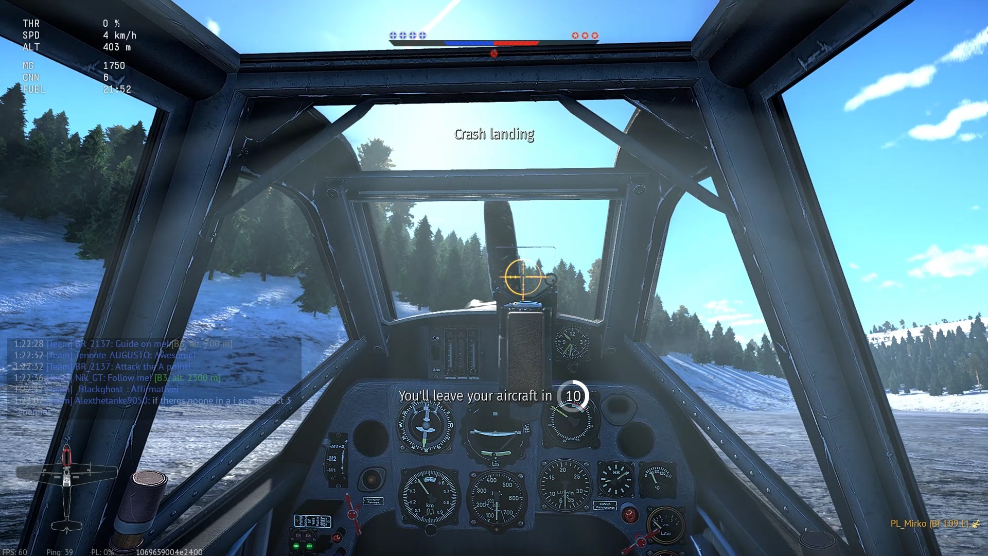 W drugim przypadku, po bolesnej nauczce nie odpuściłem wirującej Bf-ce, znalazłem ją nad samą glebą jak wiała w stronę własnej bazy. Goniłem przez przez pół mapy i dopadłem.
