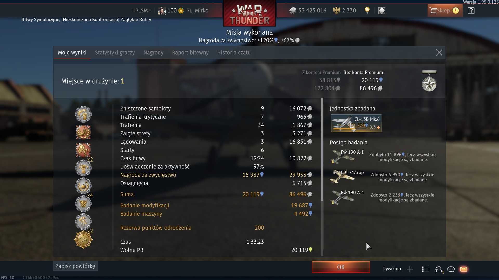 I najlepszy wynik poprzedniego tygodnia - niższy niż ten rekordowy z miesiąca lutego, ale też czas bitwy (SB Air 3 tier) krótszy o ponad godzinę. Poza tym K/D 3:1 to jak dla mnie spore osiągnięcie - zwykle standard dla mnie to K/D 1:1. Po dłuższej przerwie do zestawu GER#3 wróciły Foczki i nawet wersja A-1 okazała się najskuteczniejszą. Tylko jedno rozbicie