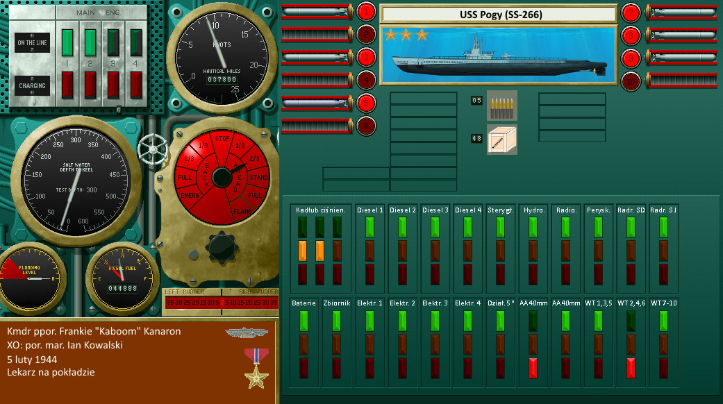 Tym razem bardziej uszkodziliśmy wrogą flotę niż zatopiliśmy, sir. 13000 BRT w uszkodzonych. Jedynie 3000 BRT w zatopionych i dodatkowo krążownik. Nie wiemy jednak czy tylko my go atakowaliśmy. Nasze 3 trafienia, a jak nas eskorta trzymała pod wodą były 2 eksplozje. Może sami się zatopili, może jakiś inny nasz okręt też atakował. Z naszych strat to jedynie parę wgnieceń, jedno działko uszkodzone i znowu 3 wyrzutnie puściły. Muszą się bardziej w stoczni postarać, łatanie tego nic nie daje, dalsze eksplozje, które normalnie nic by nam nie zrobiły powodują, że wyrzutnie puszczają