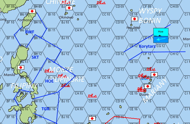 - Jak na moje oko, poruczniku, to wygląda mi na to, że nasza niebieska krecha na północy wyraźnie wbija się w ląd Samar, pozostawiając cieśninę San Bernardino, oddzielającą Samar od Luzonu w obszarze działania "SKT", a na południu wyraźnie wbija się w Leyte, zostawiając cieśniny rozdzielające Leyte od Mindanao na pastwę torped "TGR". Więc raczej nie zbliżałbym się zbytnio w rejony cieśnin na północy ani na południu naszego rejonu, aby nie oberwać torpedą od któregoś z kumpli, który może tam polować i ciutkę zapędzić się w pogoni za wrogiem.