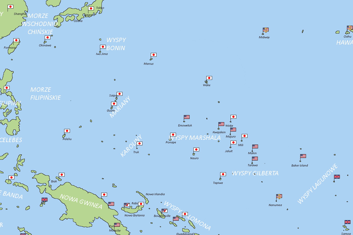 Na południu MacArthur zaciska pierścień wokół Rabaul. Bariera Bismarcka jest teraz tak dziurawa, że praktycznie mamy swobodę operacyjną... ale nie swobodę operowania. Na Rabaul i Truk wciąż stacjonują siły złożone z niszczycieli i lekkich krążowników... Wszystko co ciężkie wycofano do Palau (Peleliu to jedna z wysp Palau, dop. Finka). Przełamaliśmy barierę z Wake do Papui, to teraz szykują nową wzdłuż Marianów... I wygląda, że tu chcą stawić opór, wykorzystując fakt, że nie mamy baz w pobliżu. Truk byłoby dobre, ale samo zajęcie atolu może być kosztowniejsze, niż wszystkie wyspy, które do tej pory zdobyliśmy.... I admirałowie zastanawiają się, czy nie uda się go też zneutralizować.... Niemniej w tej okolicy - zatoczył palcem po Marianach, Palau i Karolinach - koncentruje się teraz nasza uwaga. Blokada Marian, Palau i Truk. Rabaul leży w gestii admirała Christie (z Australii Wschodniej, dop. Finka). Nasze główne zadanie to odcięcie wrogich garnizonów od zaopatrzenia, posiłków oraz utrzymanie w szachu ich floty. W każdym razie - stuknął palcami w pinezki na Wake i na Marshallach - te bazy wroga możemy uznać za zlikwidowane. Dla operacji nie stanowią żadnego zagrożenia... Wywiad szacuje, że może im się czasami uda naprawić pojedyncze maszyny, ale brak im paliwa, bomb i amunicji i jest mało prawdopodobne, aby utrzymywali stałe patrole. Wroga flota też jest przetrzebiona, zwłaszcza jeżeli idzie o płaskopokładowce. Pod koniec stycznia admirał Koga informował Tokyo, aby przyspieszyć osiągniecie gotowości bojowej przez lotniskowce, gdyż został mu jeden lekki lotniskowiec, używany do przerzutu samolotów z Japonii na Mariany, a potrzebuje dwóch-trzech lotniskowców floty, aby jego siły mogły skutecznie nam się oprzeć i rozgromić nas, gdy zaatakujemy dalej. Niestety, ale wszystko wskazuje na to, że zarówno produkcja nowych lotniskowców i szkolenie załóg, jak i naprawa uszkodzonych postępuje bez większych opóźnień... I to pomimo strat, jakie zadaliśmy.... Japończycy musieli uratować załogi tych okrętów i nimi obsadzają nowe jednostki.... Tak więc marsz do Tokyo nie jest jeszcze tak prosty. My mieliśmy Midway, oni mogą też dostać taką okazję, gdy my popełnimy podobny błąd...