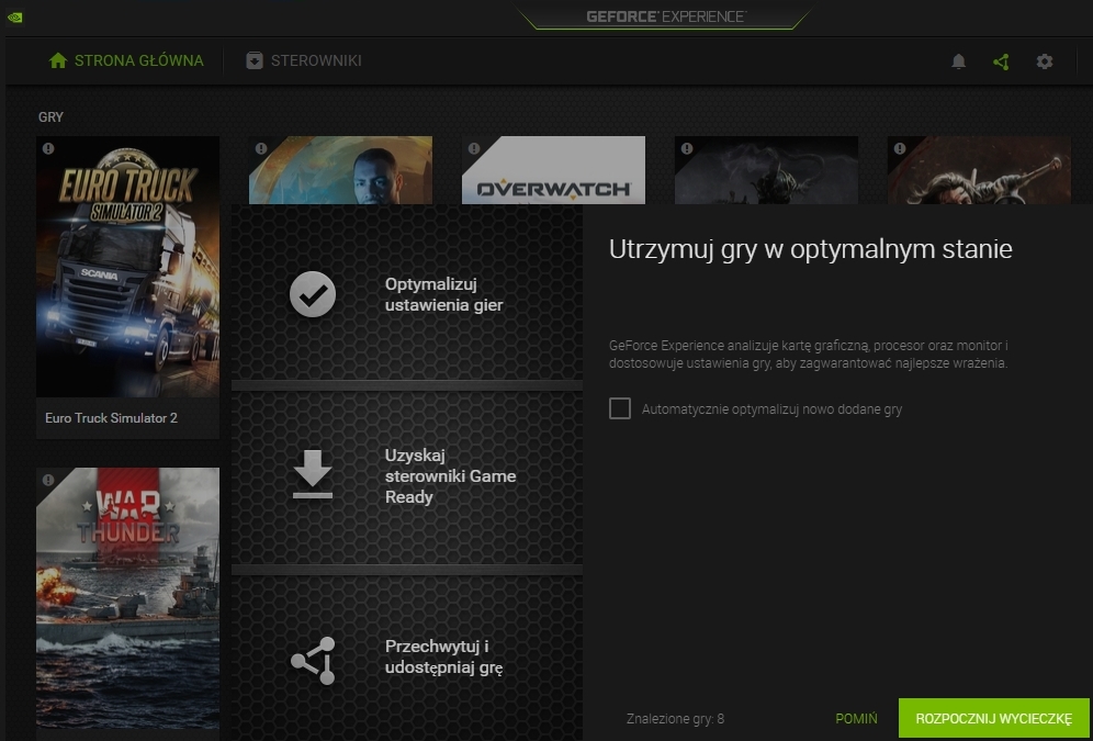 Jeżeli nie korzystasz z GF Experience zalecam zaznaczenie pola 2 "Sterownik graficzny NVIDIA" - instalacja tylko sterownika. Po instalacji GF Experience w pamięci rezyduje wiele modułów NV w tym interesujący nas "NVIDIA ShadowPlay helper". II. Pierwsze uruchomienie.