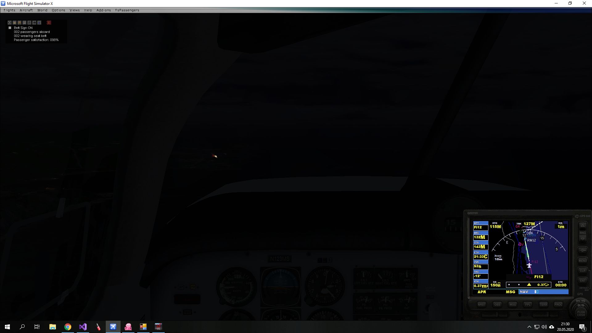 A na zewnątrz ciemno fest, kontynuuję lot na prawym zbiorniku Do tego wiatr, chmury, źle wyważony samolot przez paliwo... Do tego brak tej matrycy jeszcze ze wskaźnikami tak istotnymi jak wysokościomierz, prędkość pionowa i sztuczny horyzont... A że postanowiłem przez takie ładne tereny pilotować cały lot sam, bez autopilota to ta krótka chwila stuknięcia w wskazówkę wystarczyła abym stracił z oczu punkty odniesienia... Wiedziałem, że bez sztucznego horyzontu to może starczy czasu na odmówienie paciorka... No to się wychyliłem znad kokpitu żeby spojrzeć na sztuczny horyzont na monitorze... Troszkę zafundowałem pasażerom delikatne przeciążenia i zawijasy, ale nie na tyle żeby to zauważyli czy odczuli na szczęście. Dość dobrze sobie poradziłem