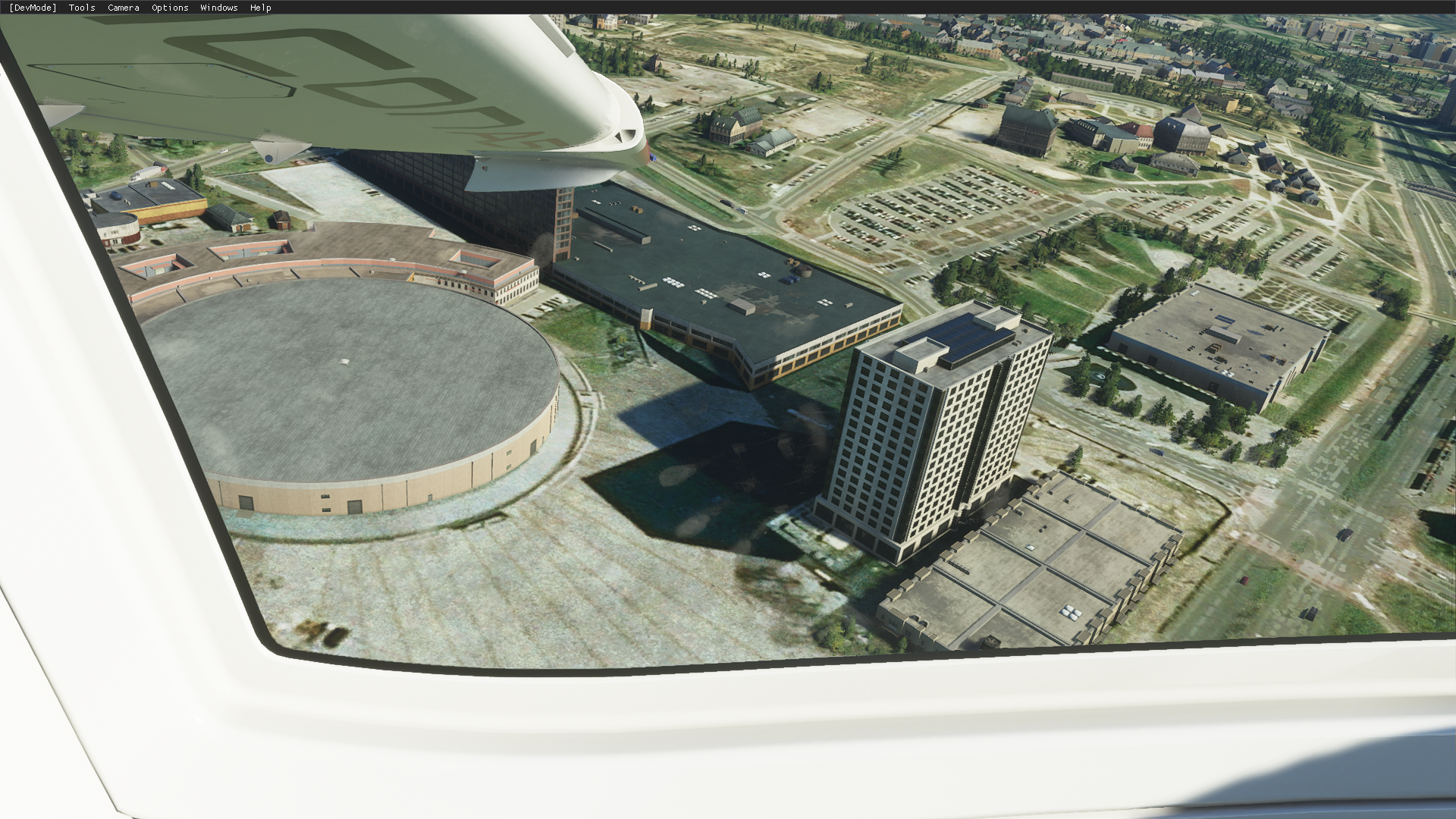 A tymczasem postanowiłem się pobawić w "napraw Katowice". Nie godzi się latać po Katowicach jeśli Spodek wygląda jak bunkier... No to zacząłem się bawić w wstawianie modeli 3D wyexportowanych z map googla. Troszkę się pobawić z umiejscowieniem trzeba było I efekt końcowy zadowalający: Teraz tylko poprawić resztę ciekawych budynków w Katowicach