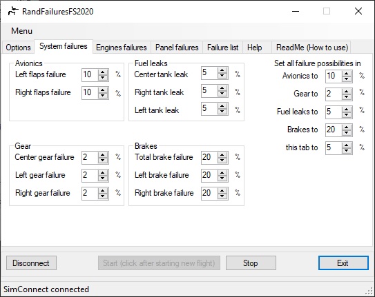 Potem to już poszło lawinowo. Zebrałem niemal wszystkie opcje awarii, dodałem opcję, że awaria może się wylosować od razu, w czasie startu, po czasie jakimś lub na jakiejś wysokości. Potem dodałem jeszcze więcej awarii i zmajstrowałem ładny interface