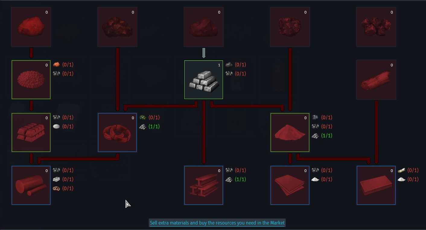 Z nich będziemy produkować potrzebne nam komponenty, zgodnie z cennikiem. Istnieje też możliwość wymiany jednej rudy na inną (przycisk "przepis"), ale poza wymianem włókien na rudę miedzi/aluminium, nie wydaje mnie się zbyt opłacalne.. Można to zrobić na sam koniec.