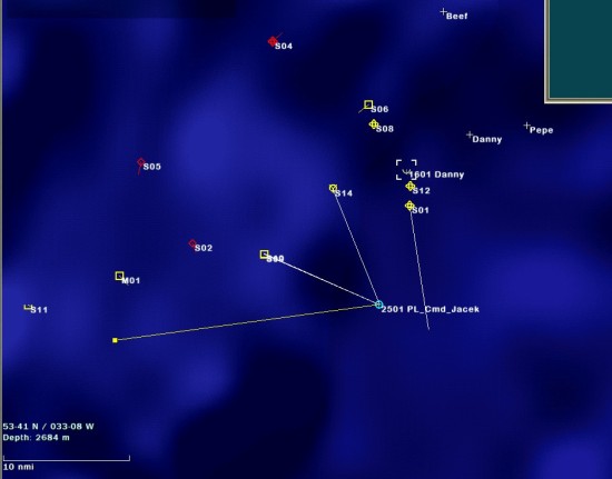 Po określeniu ogólnego kierunku ataku, płynąłem pod warstwą. W międzyczasie, jeden z naszcych Victorów poszedł na dno po trafieniu torpedą ze śmigłowca.
